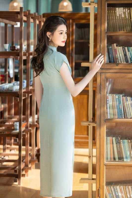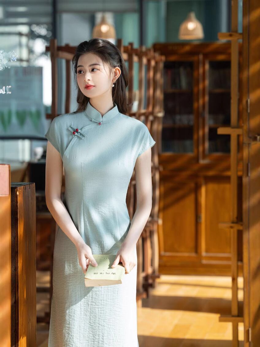 ワンピース レディース 新中華風 チーパオ ノースリーブ スリムフィット ロング丈 チャイナボタン スタンドカラー 斜め襟 エレガント レトロ 天青色 ポリエステル スリット入り