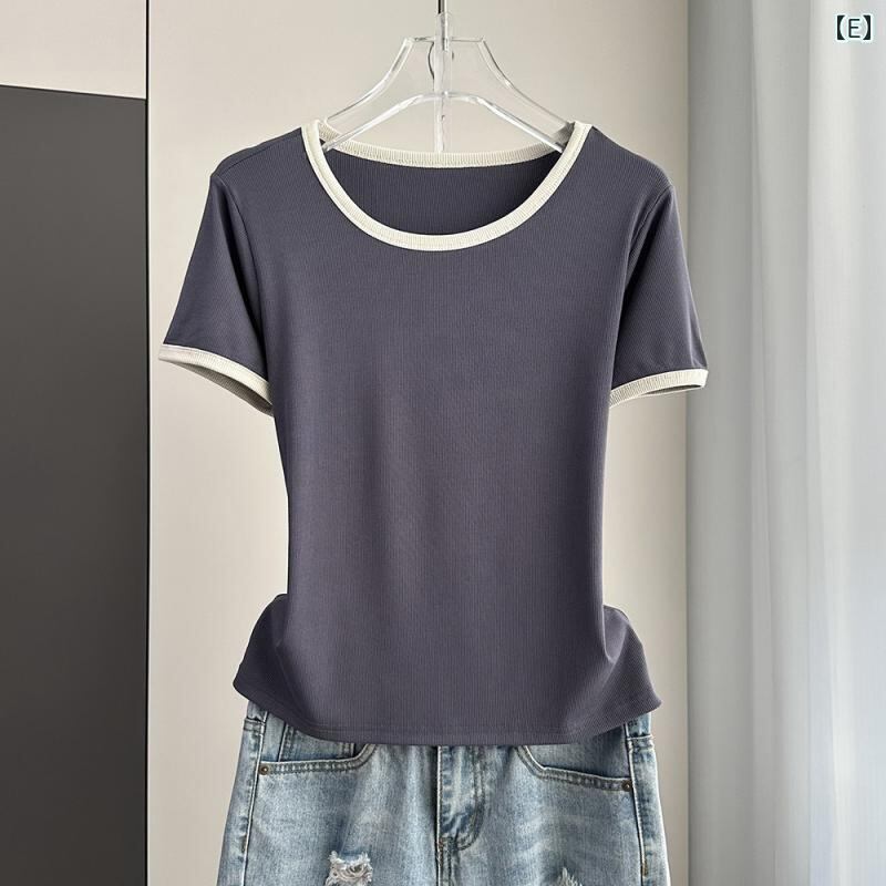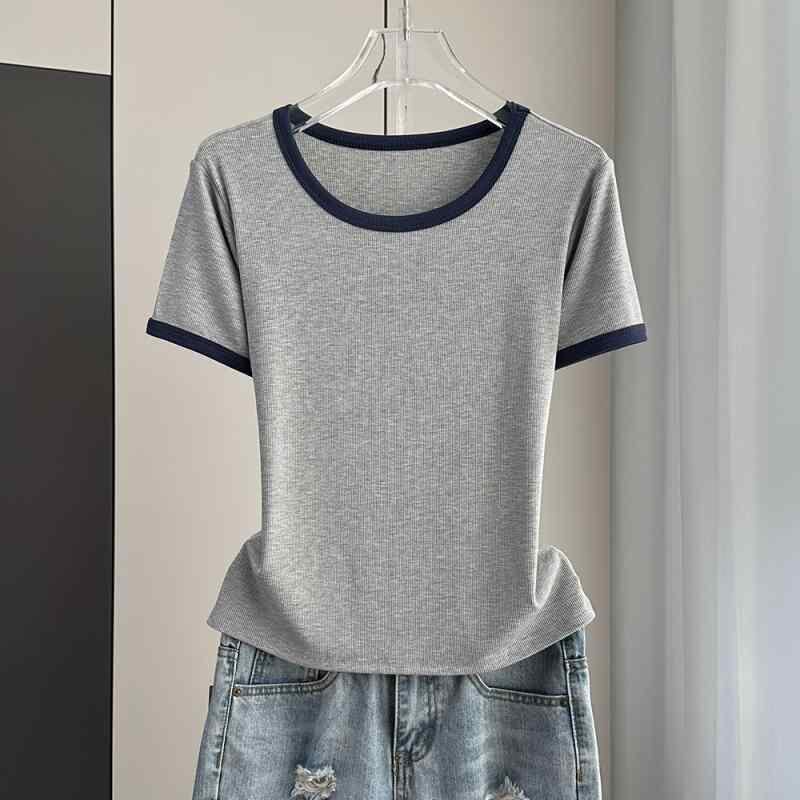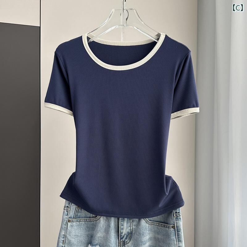 Tシャツ レディース 半袖 カジュアル モダール リブ編み ゆったり 大きいサイズ ルーズフィット トップス カットソー クルーネック 体型カバー 着痩せ効果 配色デザイン 春夏 デイリーユース