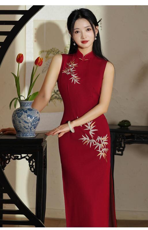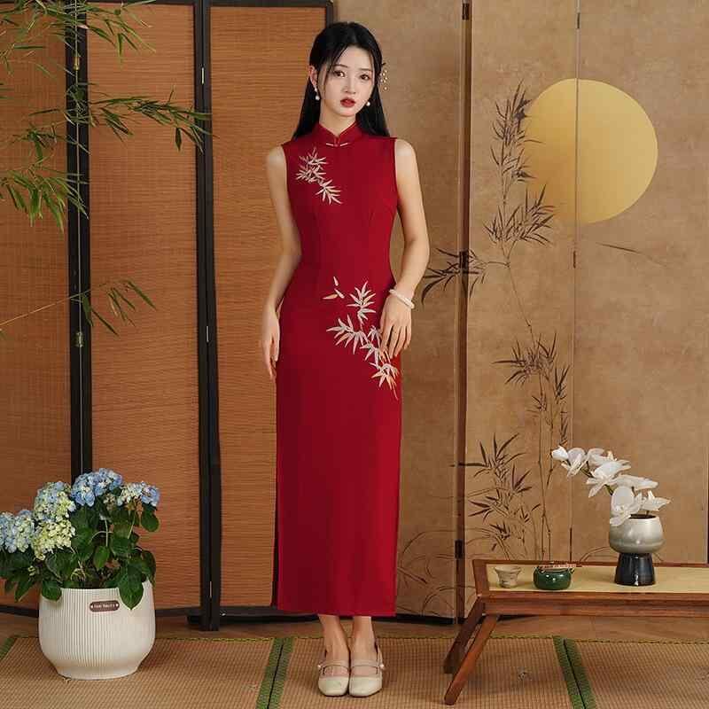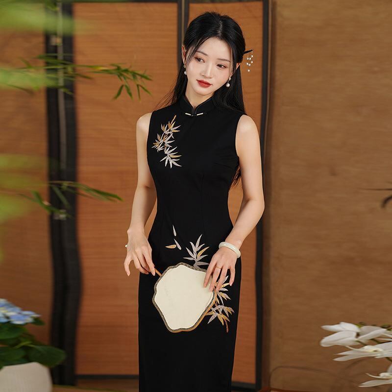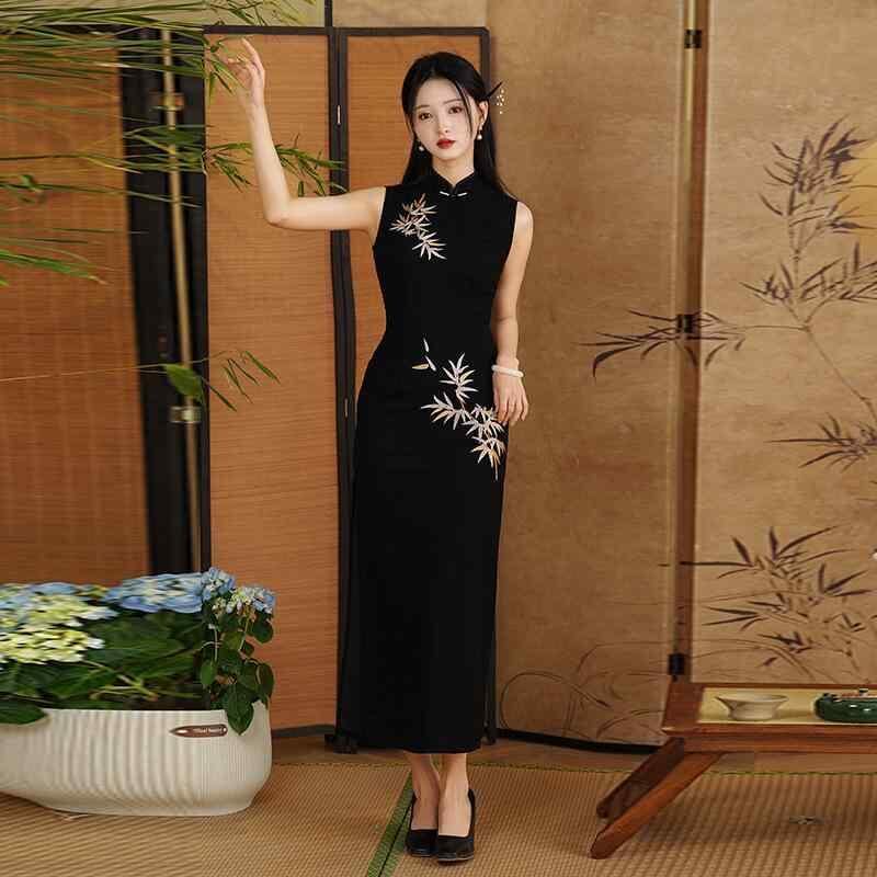 チャイナドレス レディース 改良型 新中国風 ワンピース 竹葉刺繍 黒色 パーティードレス フォーマルドレス イブニングドレス 高級感 エレガント 上品 立ち襟 半袖 ミディ丈 スリット入り ラインストーン装飾 通勤 オフィススタイル