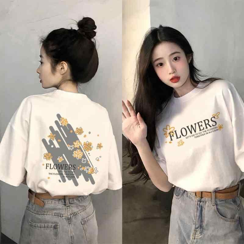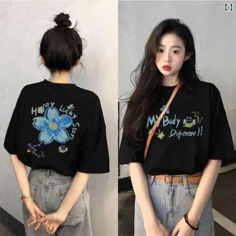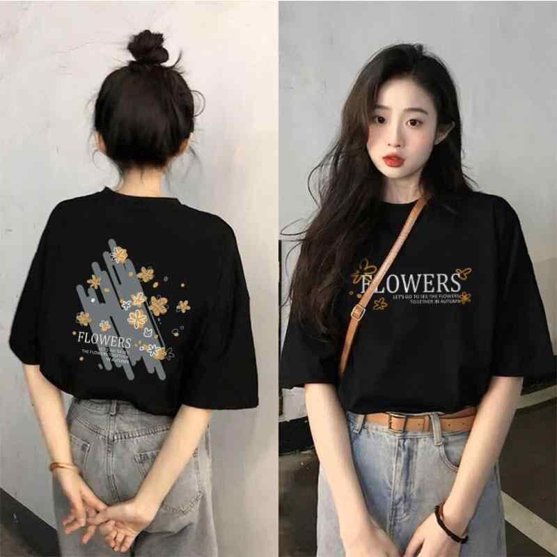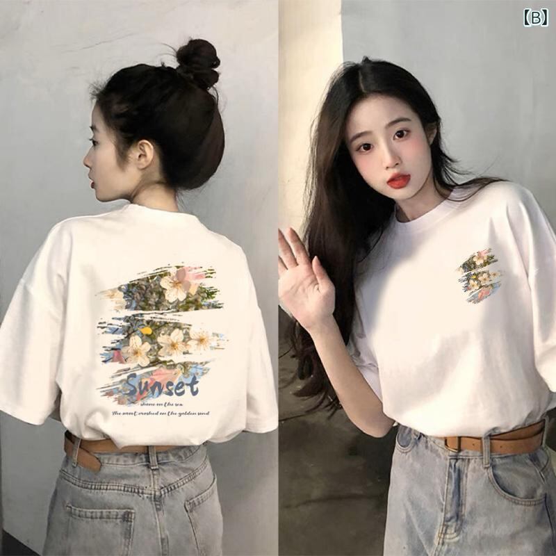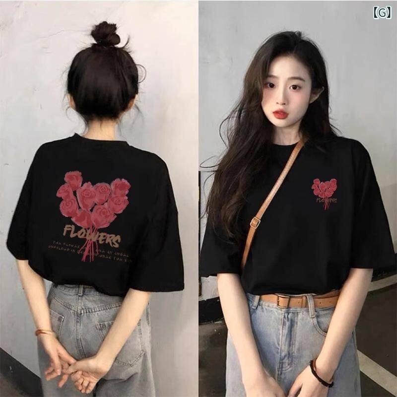 トップス レディース 半袖 Tシャツ カットソー 黒 花柄 フラワー プリント 綿 ゆったり ルーズフィット クルーネック 体型カバー 着痩せ おしゃれ カジュアル ミドル丈