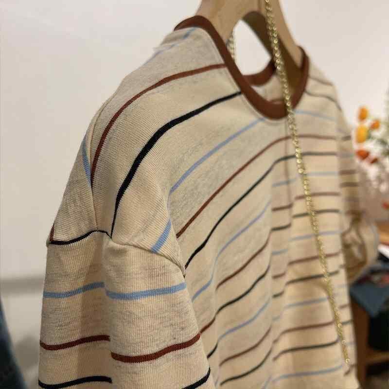 Tシャツ トップス レディース 半袖 コットン ストライプ アプリコット ベージュ 配色 ゆったり 大きいサイズ ルーズフィット 着痩せ 体型カバー ラウンドネック カジュアル 普段使い