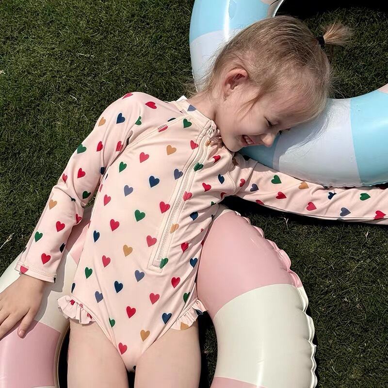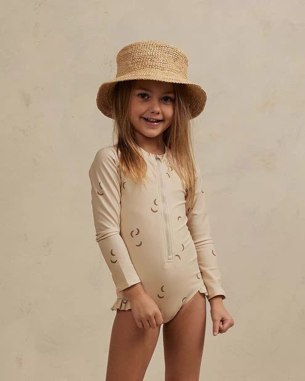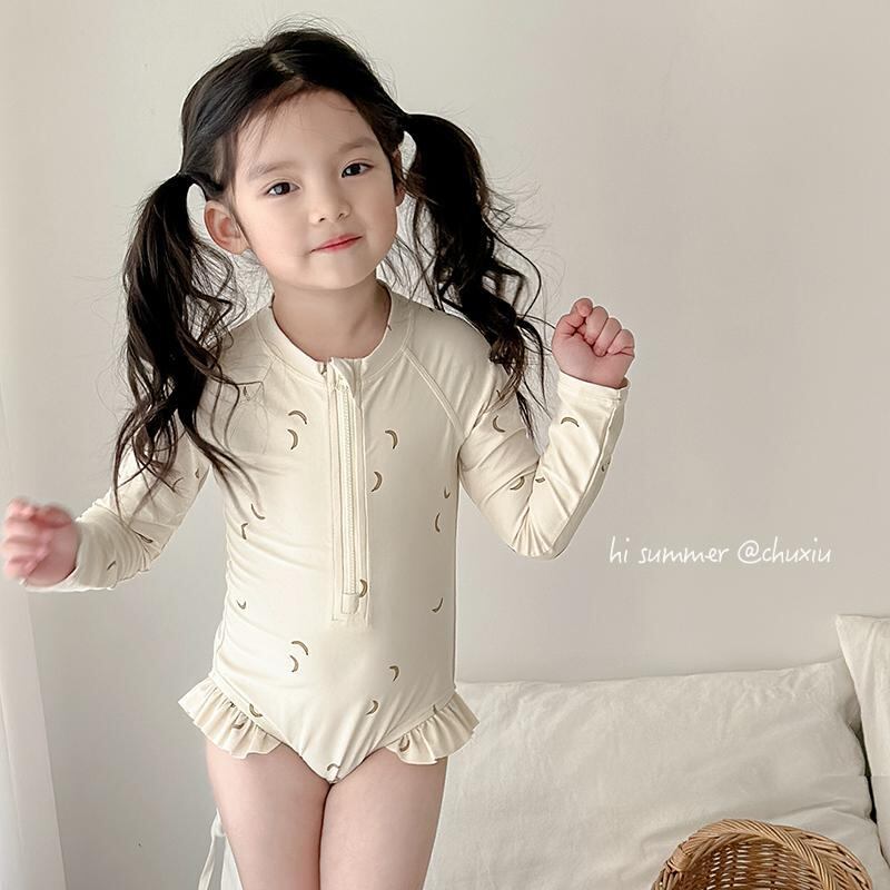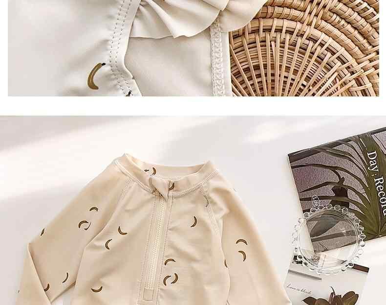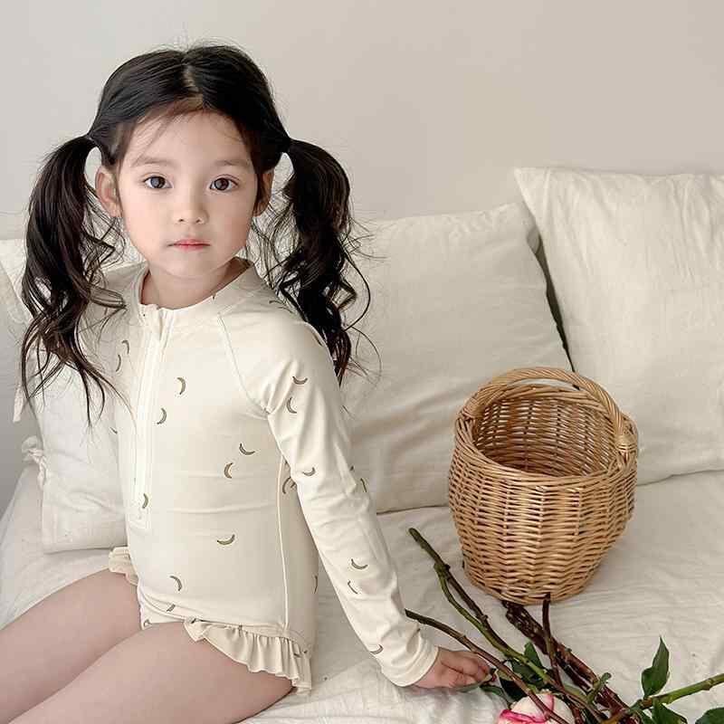 水着 キッズ 女の子 ベビー ワンピース 長袖 UVカット 速乾 かわいい おしゃれ プール 海水浴 水遊び ポリエステル スパンデックス素材 アイボリー バナナ柄