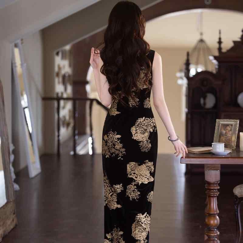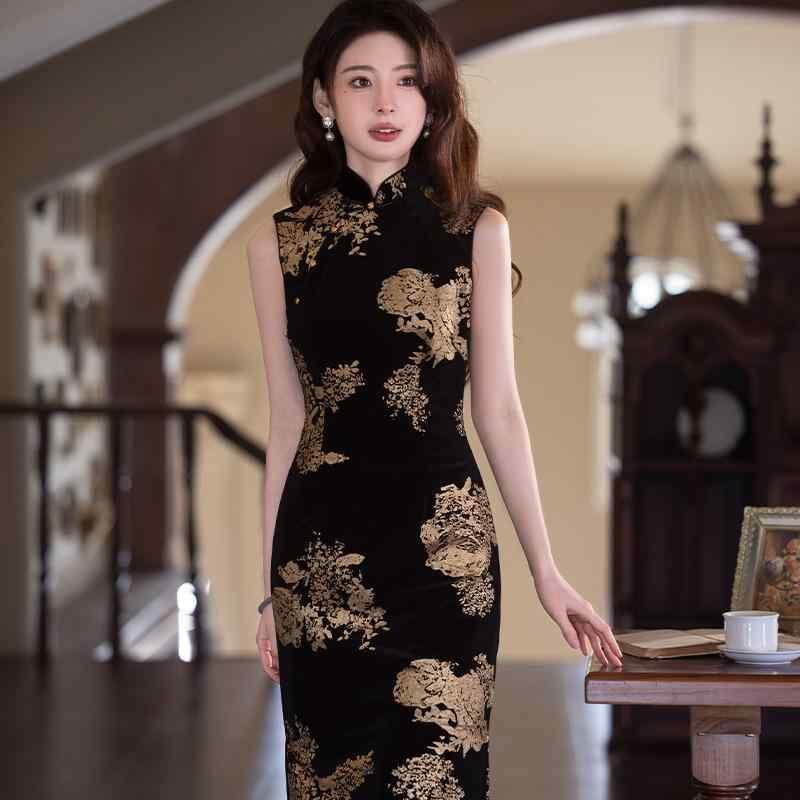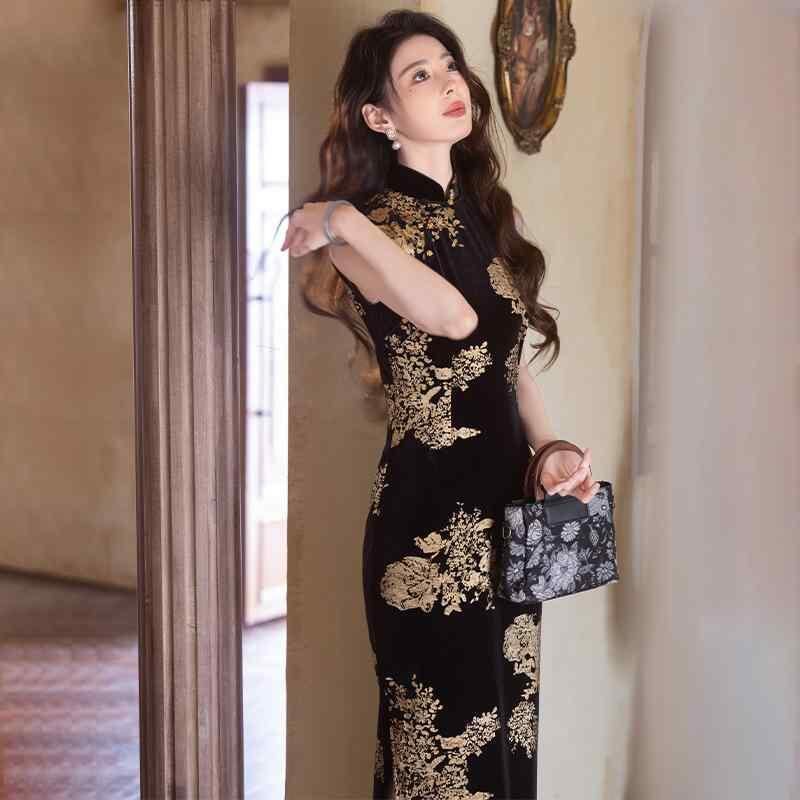 チャイナドレス レディース 新チャイナ風 モダン ベロア 箔プリント エレガント 上品 ハイウエスト 細見え ロング丈 Vネック 斜め襟 七分袖 スリット レトロ クラシック ポリエステル 微ストレッチ ヴィンテージ加工