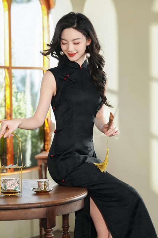 チャイナドレス 旗袍 レディース レトロ モダン 中国風 改良型 ブラック ジャガード織り ダブルレイヤー ロング丈 スリムフィット スタイルアップ 細見え ノースリーブ スタンドカラー 斜め襟 センター スリット デイリーユース パーティー
