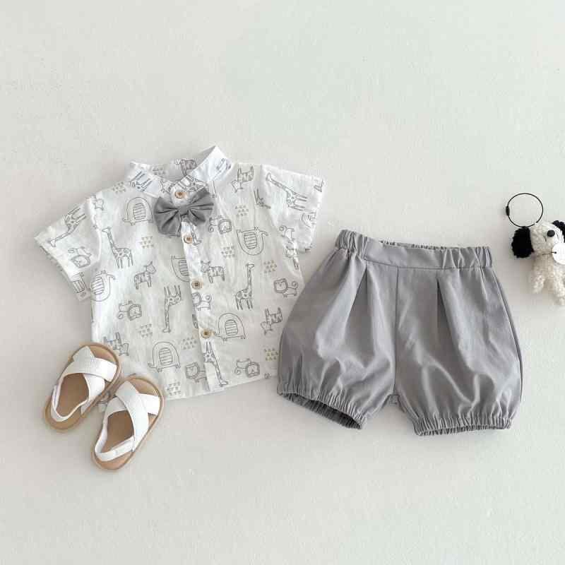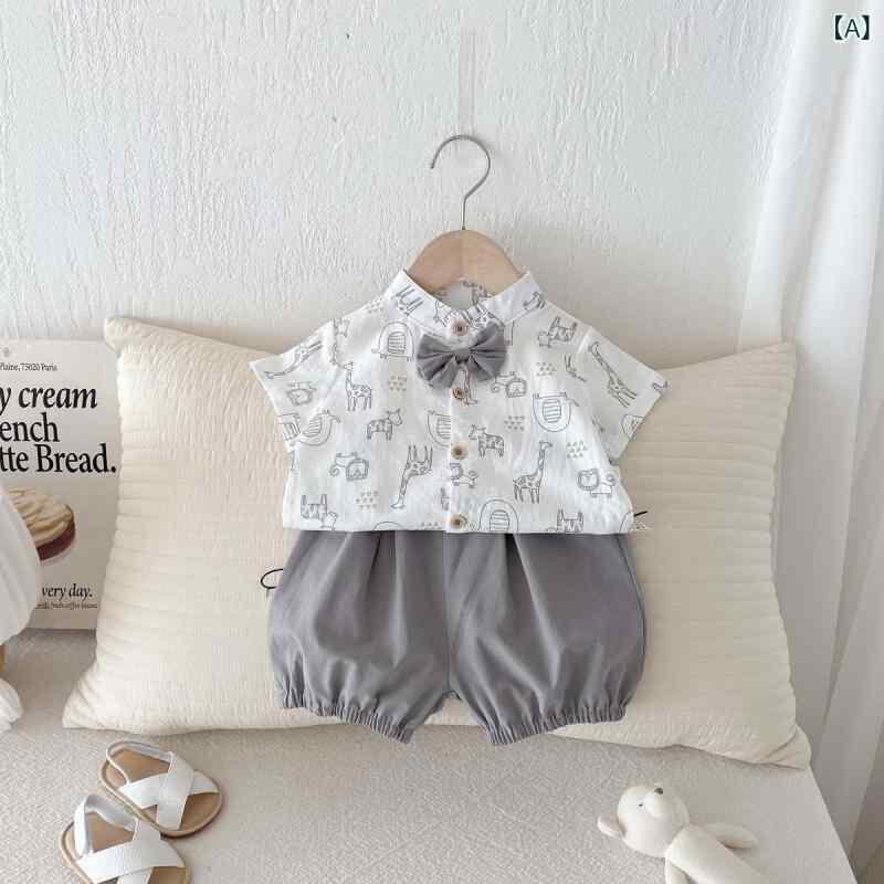 ベビー 男の子 半袖シャツ ショートパンツ 上下セット 夏服 コットン100% 薄手 柔らかい肌触り 韓国風 キャラクタープリント アニマル柄 蝶ネクタイ付き