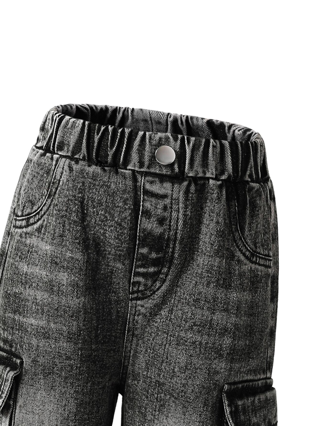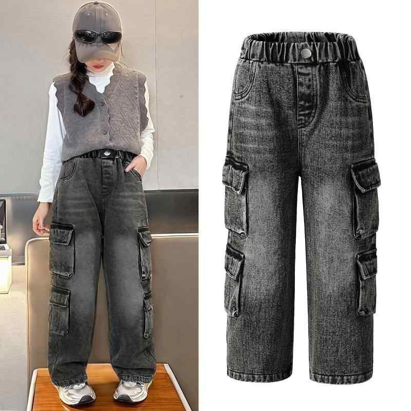 デニムパンツ キッズ 女の子 子供 3-8歳 韓国風 ユーズド加工 マルチポケット ワークテイスト おしゃれ カジュアル ワイド ストレート ロング丈 ミドルウエスト コットン 無地 ウエストゴム 柔らか素材 夏コーデ 通園 通学 普段着