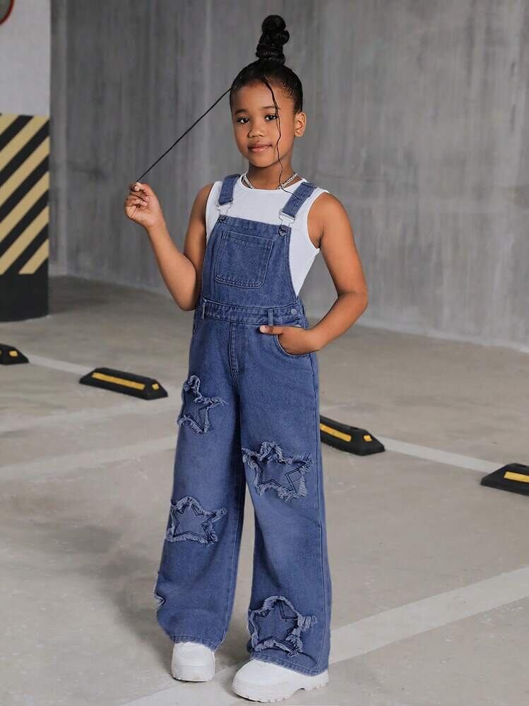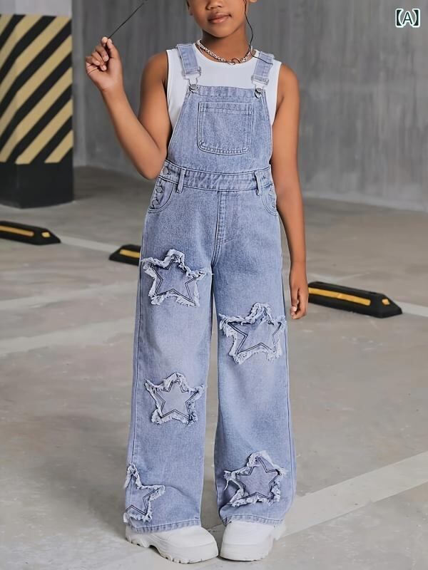 サロペット ジュニア ガールズ 星柄 デニム オーバーオール ワイドシルエット ゆったり コットン ハイウエスト 春 夏 秋 カジュアル 普段使い 通学 お出かけ ブルー系 ブラック ホワイト
