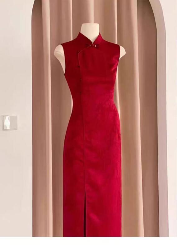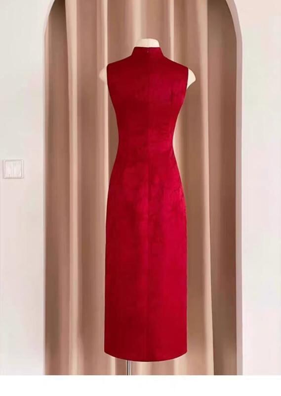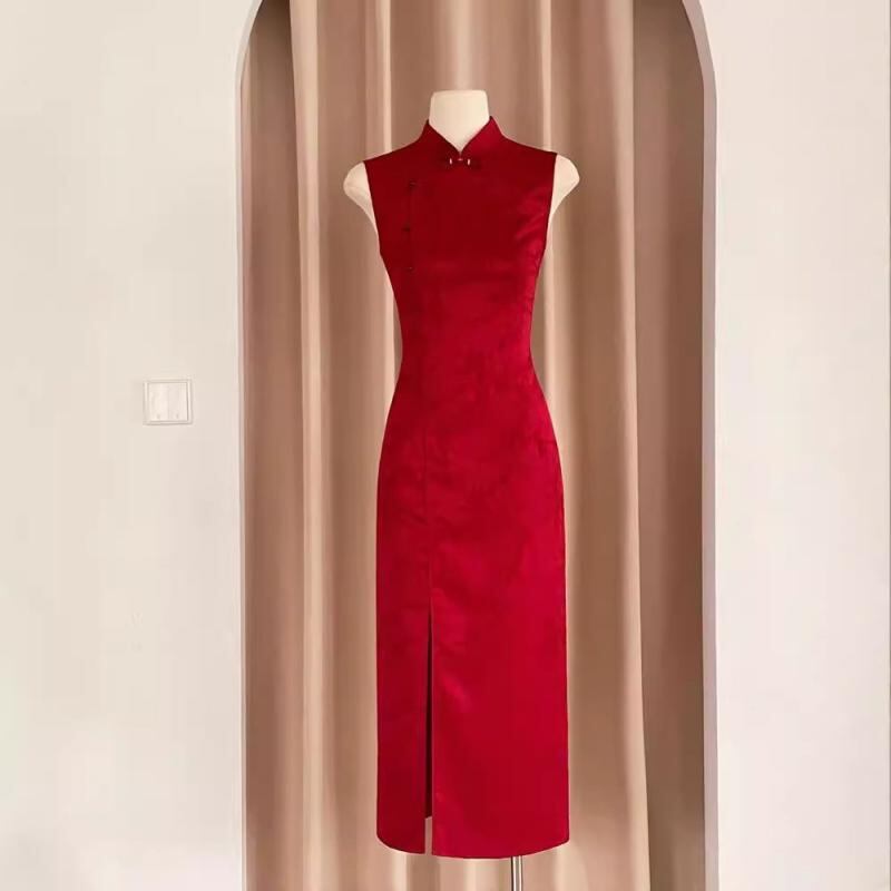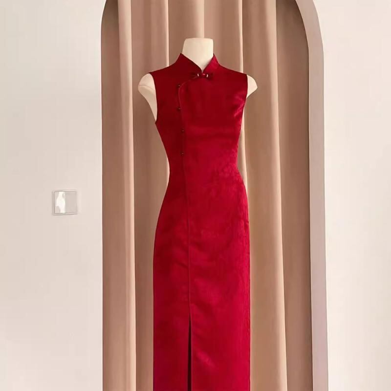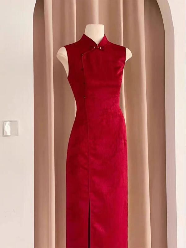 チャイナドレス 旗袍 レディース 女性用 花嫁 披露宴ドレス 新婦 結婚式 二次会 パーティードレス 演奏会 発表会 モダンチャイニーズスタイル 改良型 ミディアム丈 立襟 ノースリーブ レトロモダン ポリエステル ワインレッド ボルドー エレガント