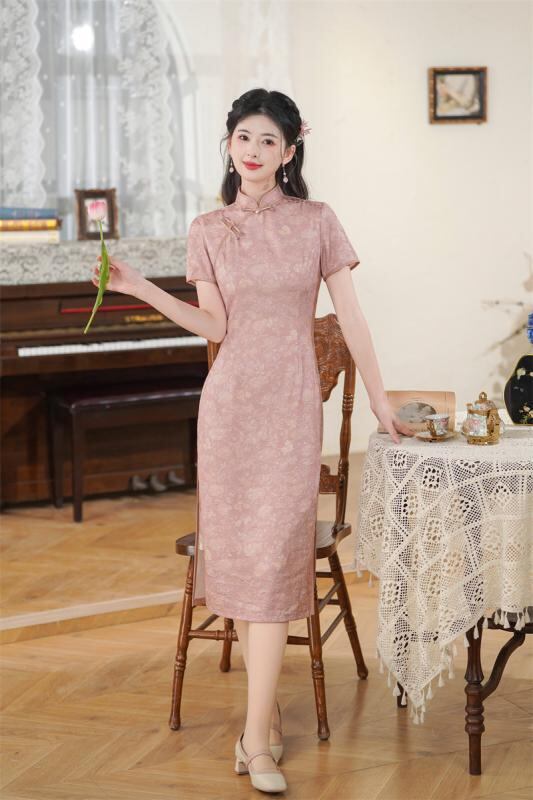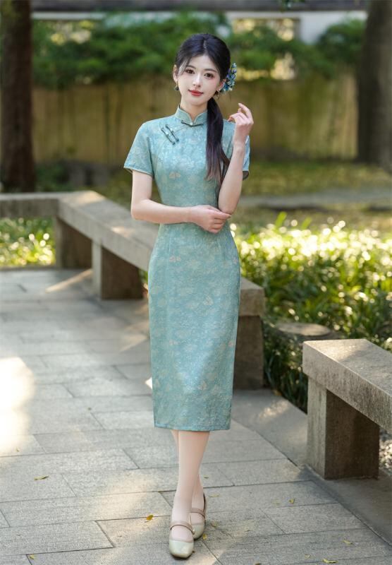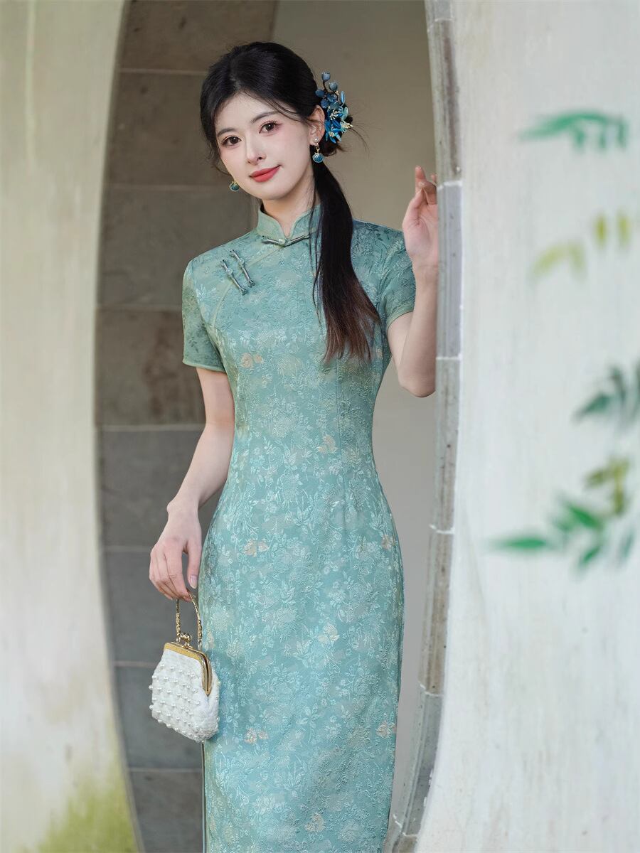 チャイナドレス ワンピース レディース モダンレトロ ロング丈 スリムフィット スタイルアップ エレガント 普段使い スタンドカラー 七分袖 ローサイドスリット ジャカード織り サテン ポリエステル スパンデックス 華やか 高級感