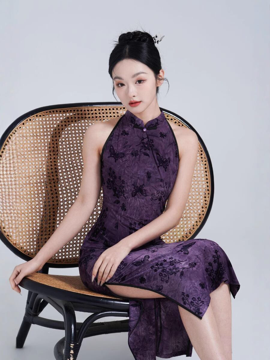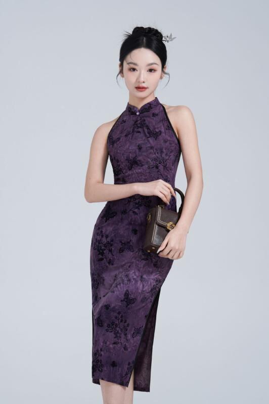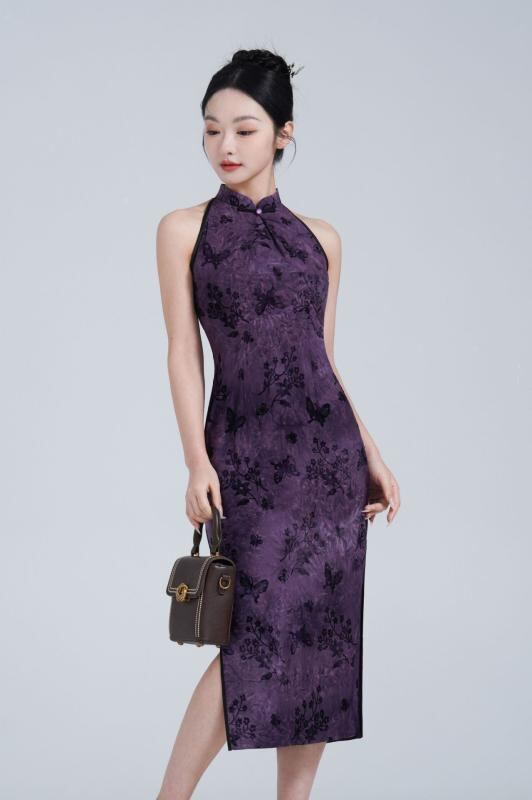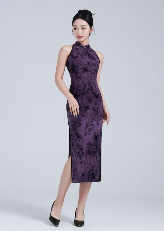 チャイナドレス レディース モダンチャイニーズスタイル パープル モーダル 再生繊維 ロング丈 スタンドカラー ノースリーブ 低スリット エレガント クラシック レトロ