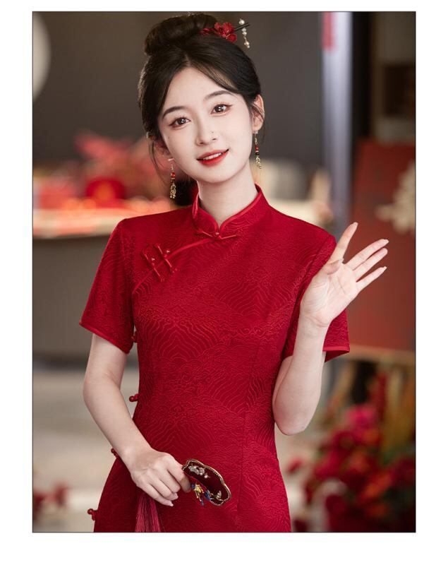 チャイナドレス レディース ニット レース 新チャイナ風 レトロ ミディ丈 普段使い 通勤 エレガント 上品 着痩せ効果 スタンドカラー 七分袖 斜め襟 低めスリット 微ストレッチ アイロン不要 立体柄 ワインレッド ポリエステル