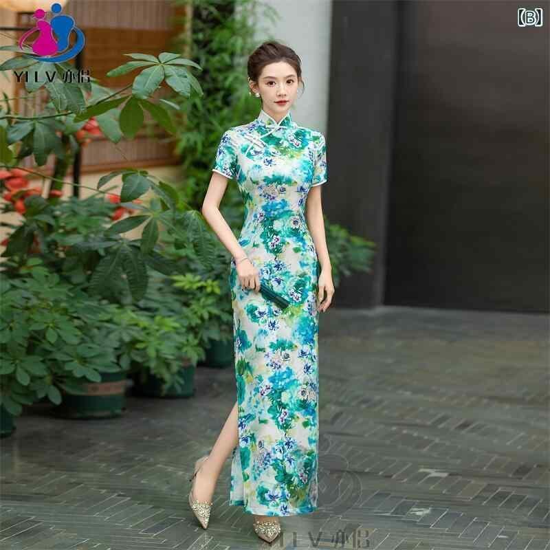 旗袍 レディース ロング丈 スレンダー 夏用 レトロ クラシカル 中国風 エレガント 上品 高級感 ポリエステル スパンデックス ストレッチ スタンドカラー 斜め襟 ハイ スリット プリント柄 フォーマル イベント パーティー 発表会 舞台衣装
