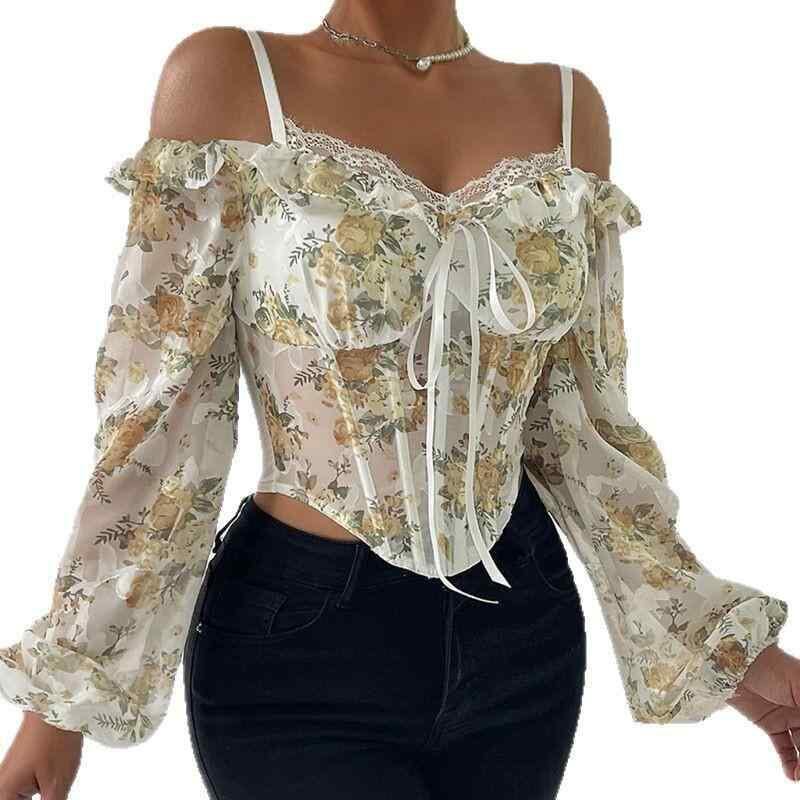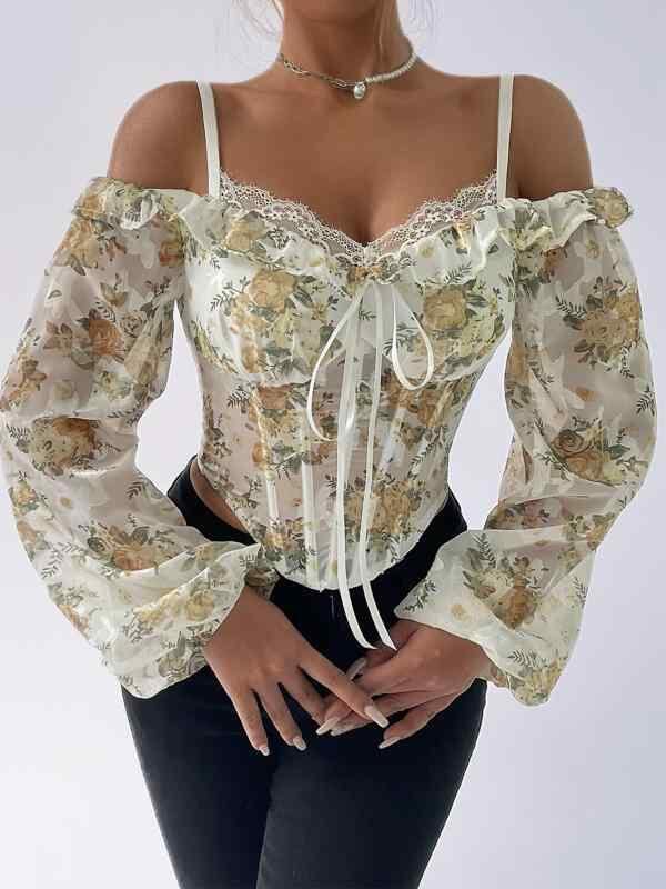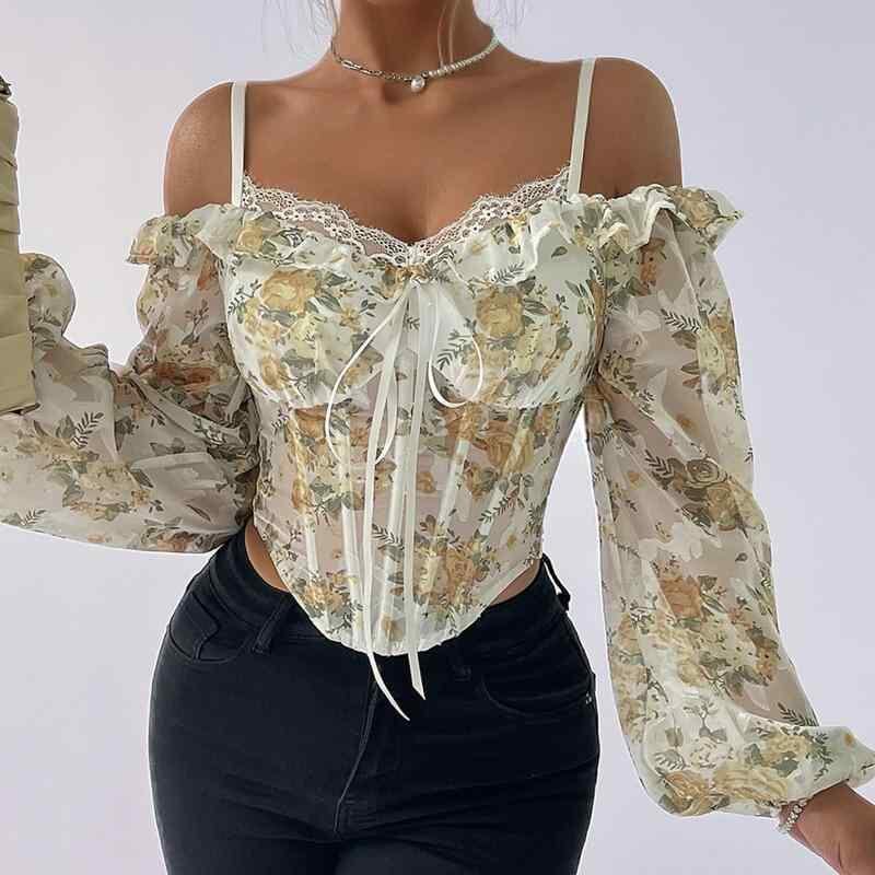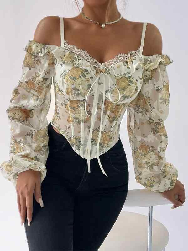 ブラウス レディース オフショルダー パフスリーブ 花柄プリント 魚骨ボーン入り スリムフィット メロウフリル ショート丈 7分袖 フェミニン スウィート ポリエステル ストレッチ ライトイエロー