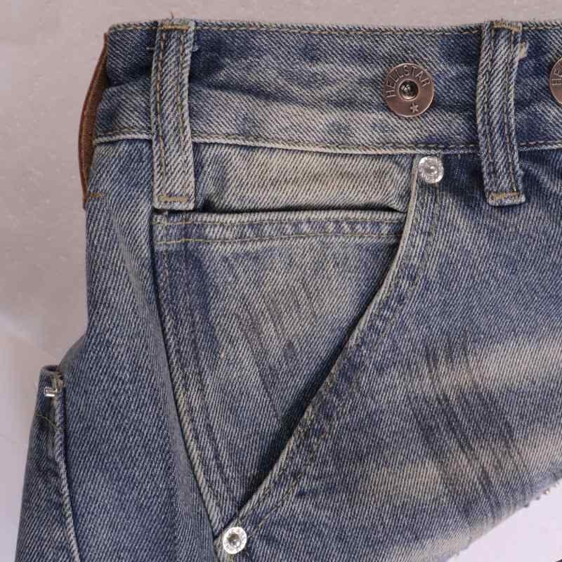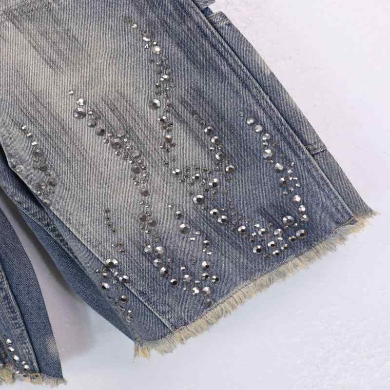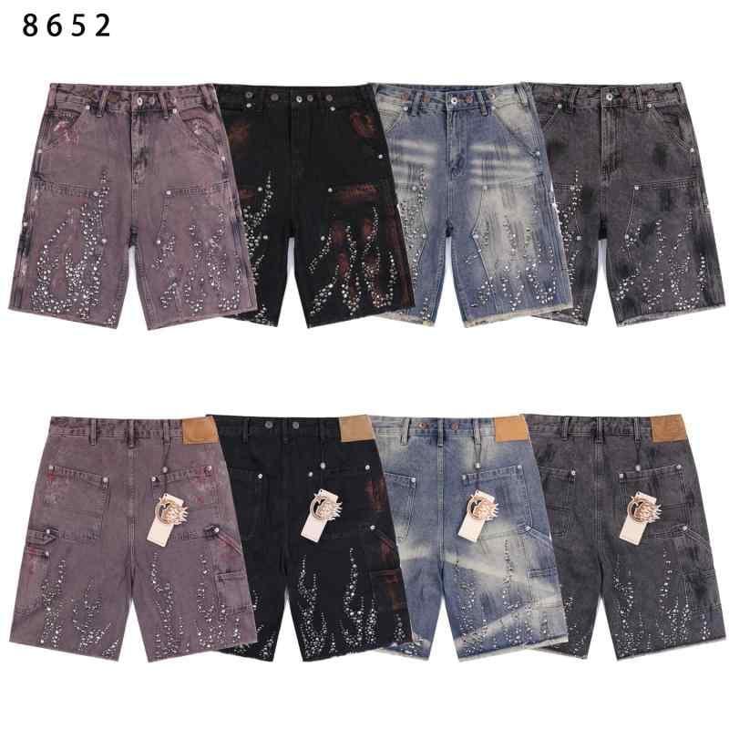 デニム ショートパンツ メンズ ラインストーン装飾 ヘビーワーク ストリート ファッション アメカジ 個性的 ゆったり リラックスフィット ウォッシュ加工 ストレート コットン 短パン ブラック グレー ブルー レッド