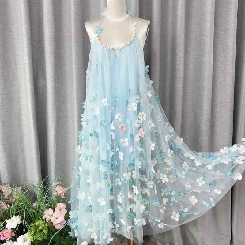 ワンピース レディース 立体フラワー 花柄 チュール キャミソール ロング丈 マキシ丈 コクーンシルエット フェアリー ドレッシー 華やか リゾート ルームウェア ナイトガウン ライトブルー シェルモチーフ