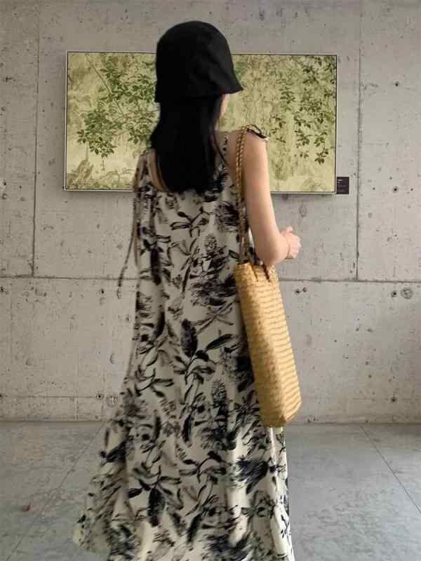 ワンピース レディース 水墨画風 花柄プリント キャミソール ギャザー ノースリーブ ミディ丈 Aライン ポリエステル製 ゆったり テクスチャード加工 普段使い カジュアル 夏 ドレス