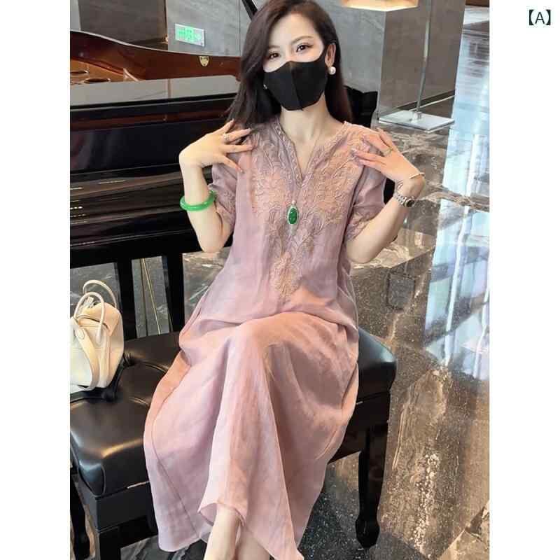 ワンピース レディース 新中国風 ヘビー刺繍 Vネック 麻 リネン 半袖 ロング丈 Aライン ゆったり 体型カバー ポケット付き 裏地付き 上品 エレガント ラベンダーカラー 普段使い リラックスカジュアル プルオーバー