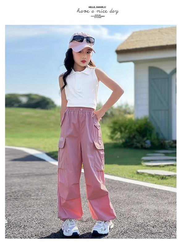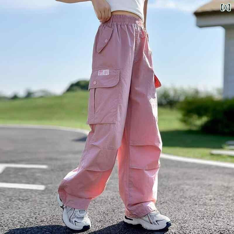 カーゴパンツ 女の子 キッズ ジュニア 夏用 薄手 ロングパンツ ストレート ゆったり リラックス カジュアル 韓国風 ウエストゴム ミッドウエスト ポリエステル 無地 ピンク ブラック 長ズボン 普段使い 通学