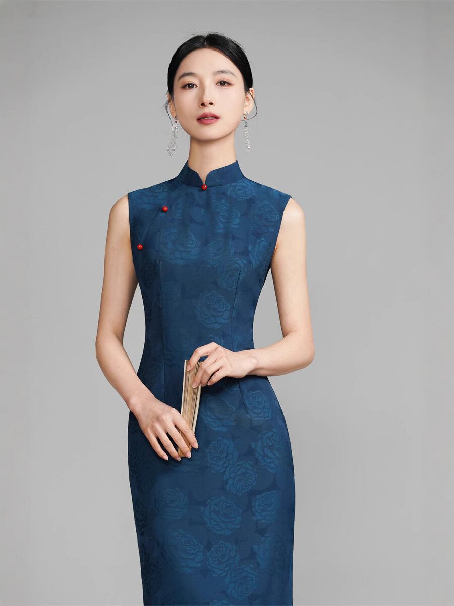 チャイナドレス レディース 夏 改良型 ジャガード織り ブルー ポリエステル スパンデックス ノースリーブ スタンドカラー 斜め襟 ロング丈 レトロ エレガント 上品 高級感 普段使い ワンピース ドレス 微ストレッチ 旗袍