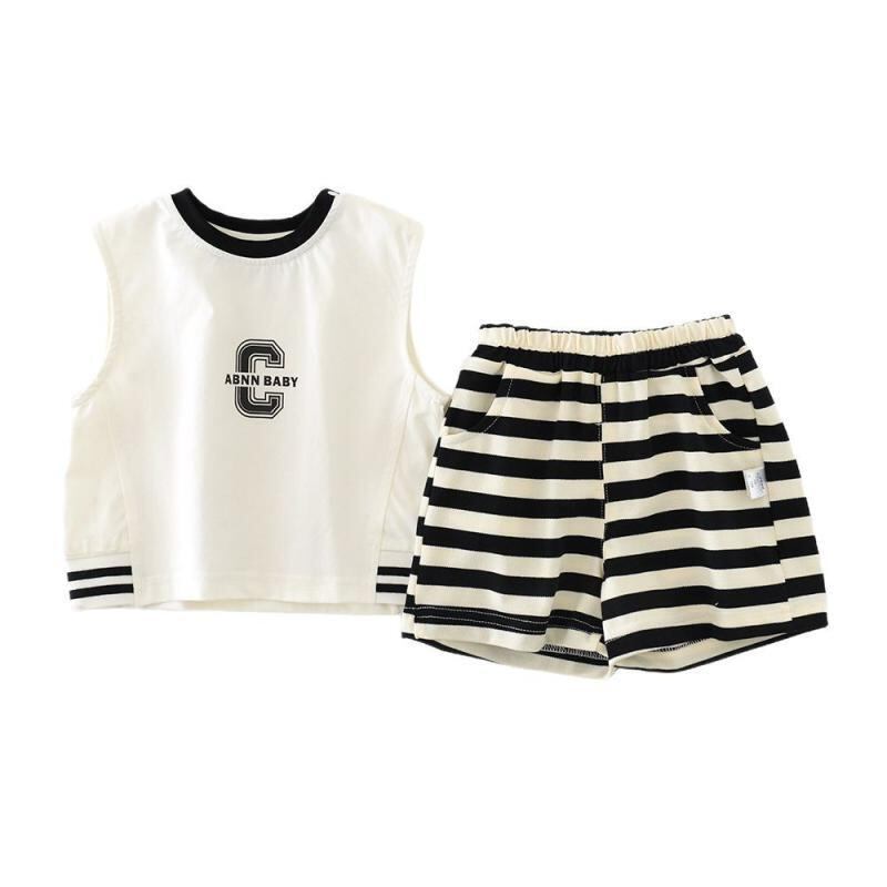 セットアップ ベビー キッズ ユニセックス 夏物 ストライプ柄 Cロゴ ノースリーブ タンクトップ ハーフパンツ 2点セット 綿混素材 薄手 柔らかい肌触り 普段着 部屋着 お出かけ カジュアル