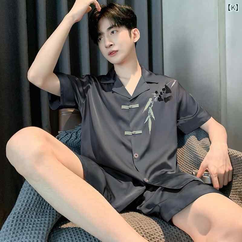 ・カテゴリ: セットアップ; ・素材: アイスシルク; ・主な素材: ポリエステル95%〜100%未満; ・生地厚み: 極薄 (81-100g/m²); ・ネックライン: 襟付き; ・袖丈: 五分袖; ・股下: 五分丈; ・機能: リラックス、通気性、睡眠、入浴、伸縮性、部屋着、涼感、快適、外出可; ・適用シーズン: オールシーズン; ・対象: 若年男性; ・使用シーン: アウトドア、室内、ホテル、浴場、フォトスタジオ; ・カラー展開: エレガントブラック、国潮風、ムーンシルバーグレー、パンダ、アプリコットシャドウ; ・サイズ展開: L、XL、2XL、3XL; ・スタイル: シンプルカジュアル