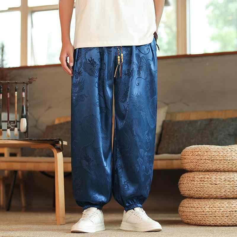 パンツ メンズ 中国風 ドラゴン柄 ワイド ジョガーパンツ 薄手 夏用 カジュアル ゆったり ルーズフィット 大きいサイズ ぽっちゃり 裾絞り 太極拳パンツ ウォッシャブル ポリエステル コットンブレンド 普段使い リラックスウェア