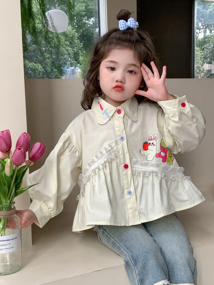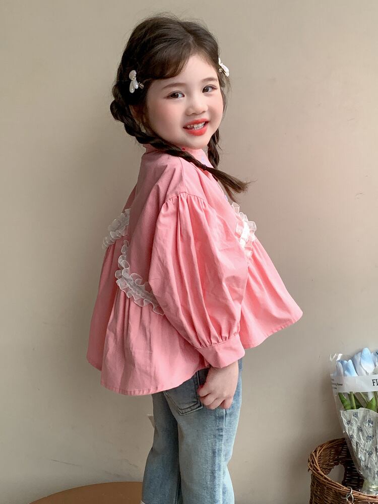 セットアップ 女の子 キッズ 子供服 レース フリル 長袖 シャツ ブラウス スクエアネック 羽織り デニムパンツ ジーンズ 綿混 柔らかい 肌触り良い おしゃれ かわいい 韓国風 カジュアル お出かけ 春 秋 2点セット
