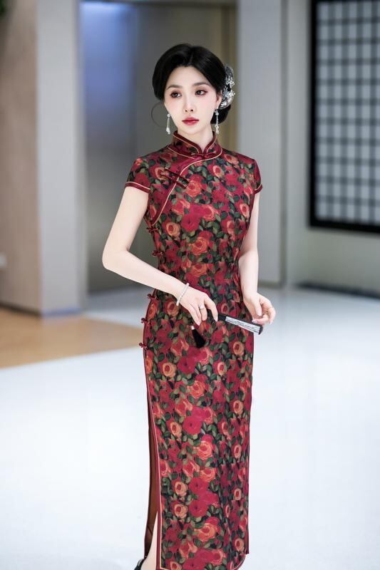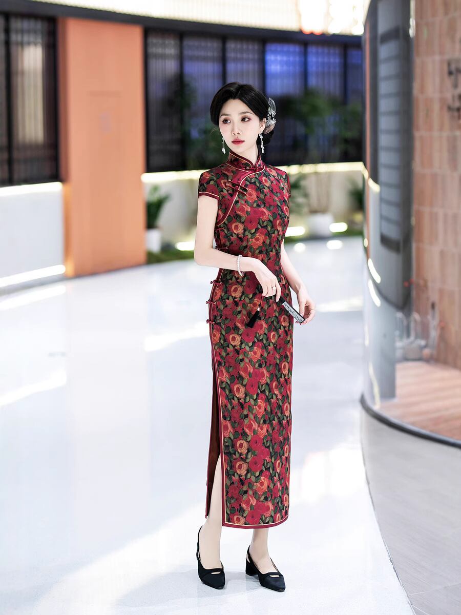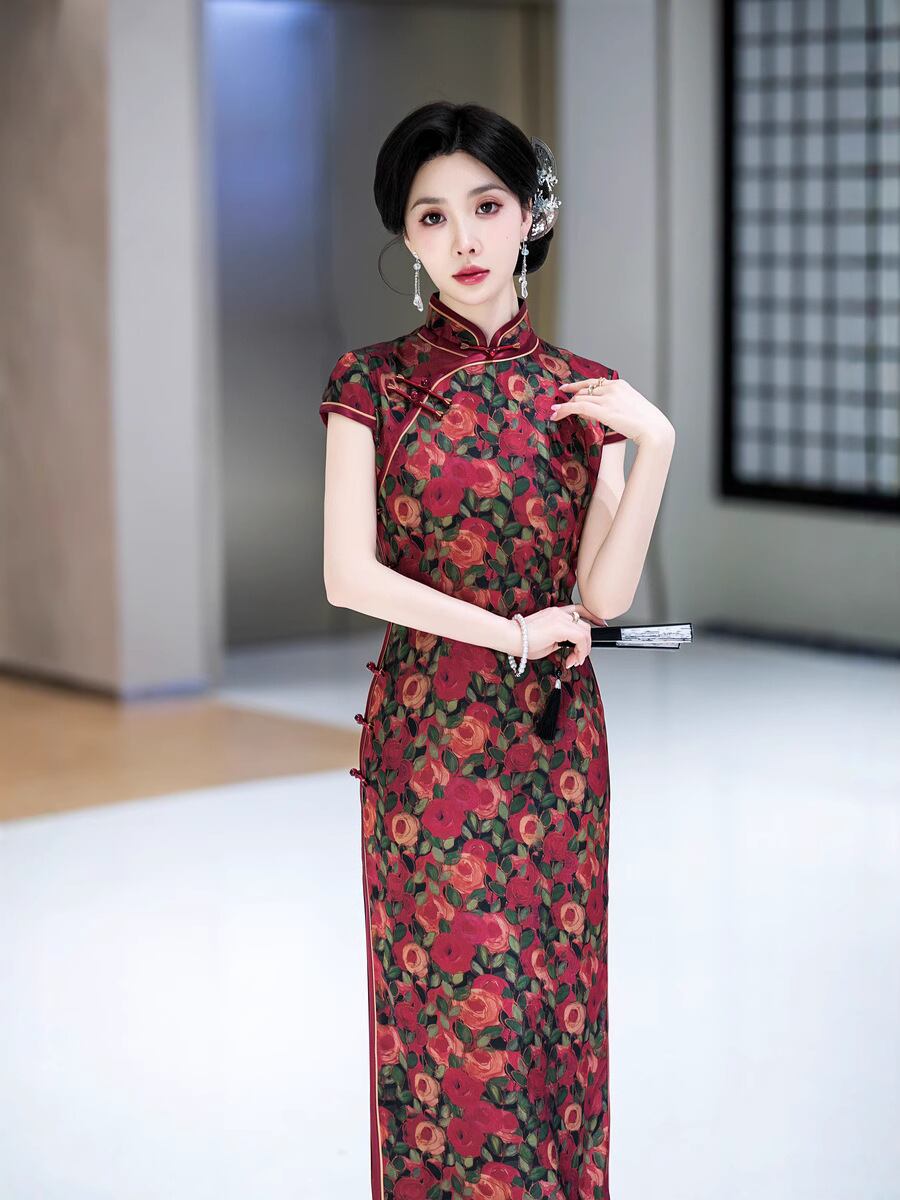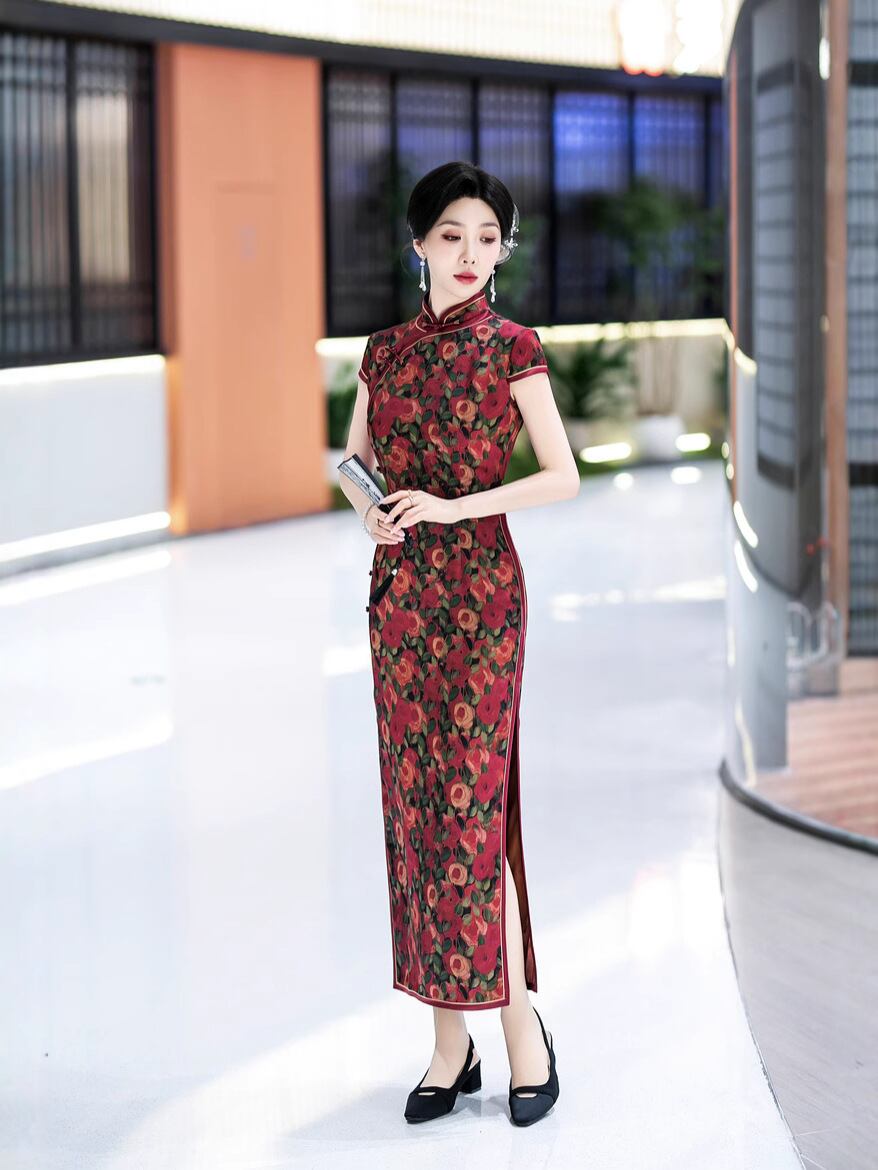 旗袍 レディース 中国風 レトロ クラシック シルク エレガント 上品 ロング丈 ハイ スリット 七分袖 スタンドカラー パーティー ドレス 演奏会 イベント 衣装 レッド ワンピース