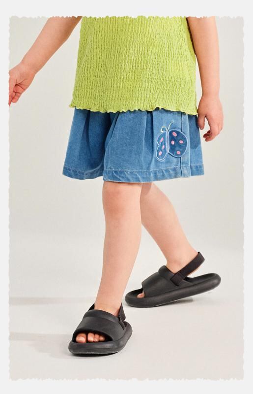 ショートパンツ 女の子 キッズ デニム プリーツ バタフライ柄 ウエストゴム コットン かわいい カジュアル ブルー ガールズ 子供服 ジュニア 普段使い 短パン