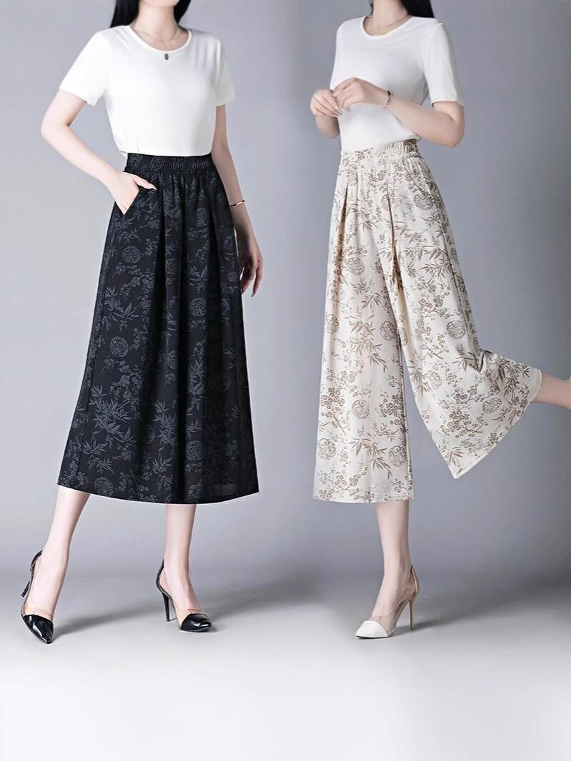 パンツ レディース 接触冷感 レトロ 小花柄 ゆったり ワイドパンツ 七分丈 ポリエステル素材 通勤 きれいめスタイル 普段使い お出かけ ブラック 杏色