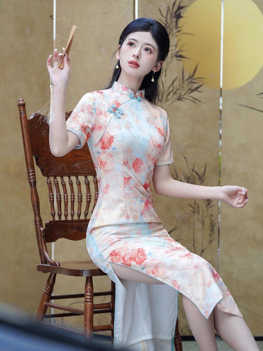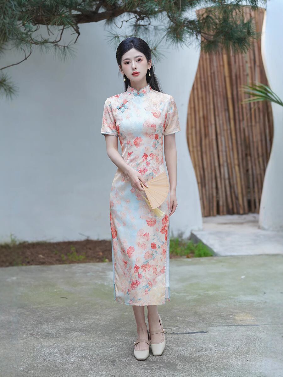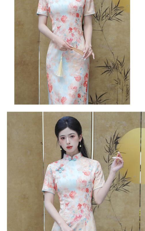 チャイナドレス レディース 改良型 花柄プリント 中国風 ロング丈 ワンピース ハイネック 半袖 レトロ エレガント 茶会服 スリット入り チャイナボタン