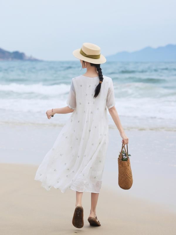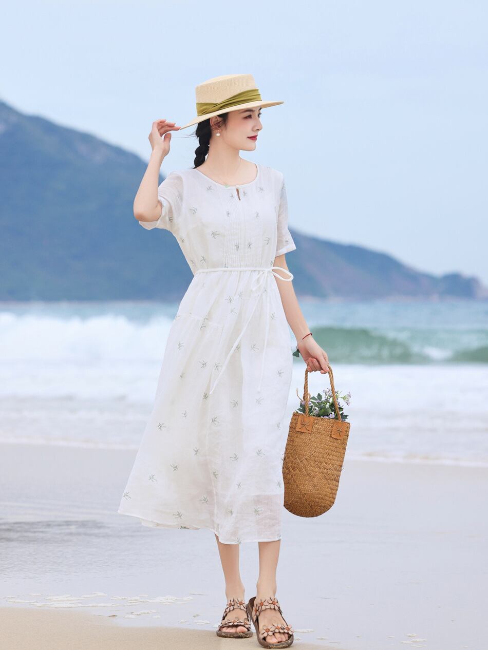 ワンピース レディース ゆったり フレア Aライン マキシ丈 ロング丈 レトロ 文芸風 クルーネック 五分袖 ラミー 麻 刺繍 ウエストリボン チャイナボタン ビーチ リゾートドレス 夏 カジュアル