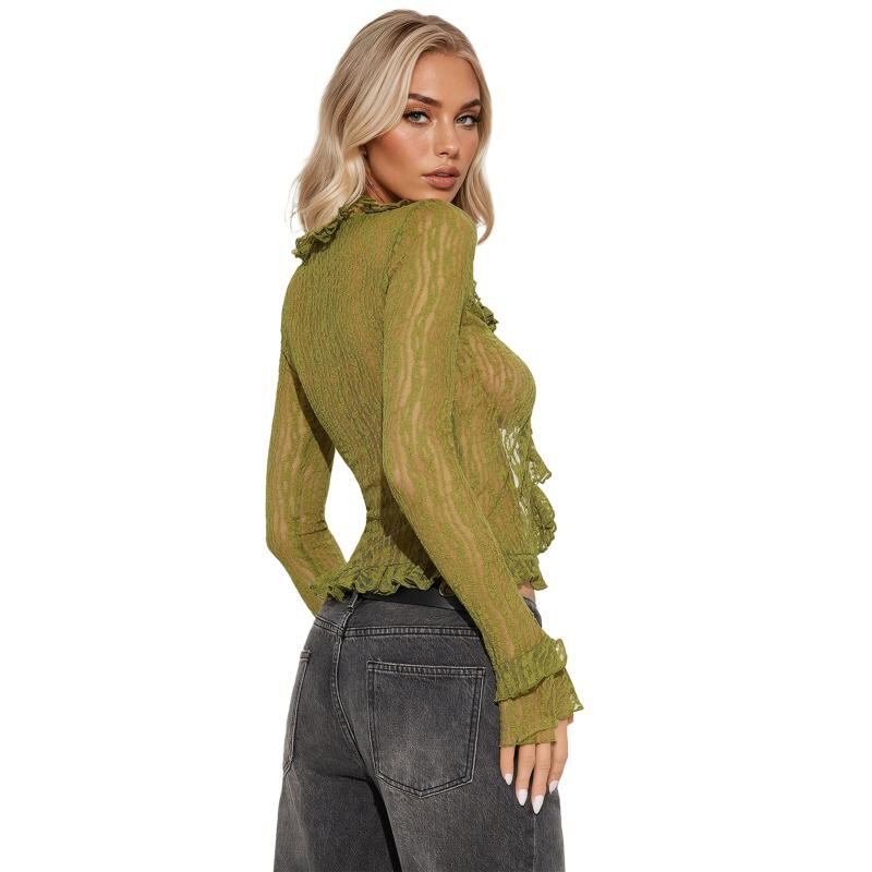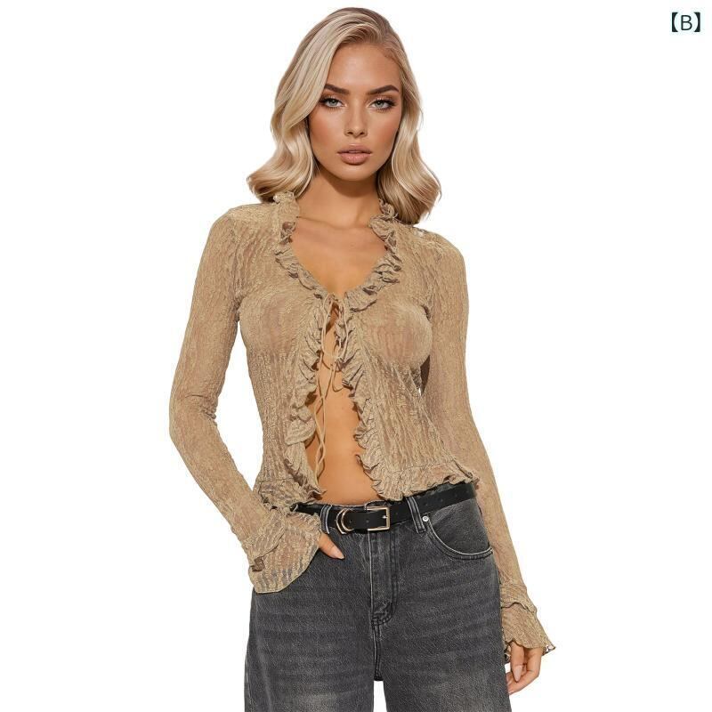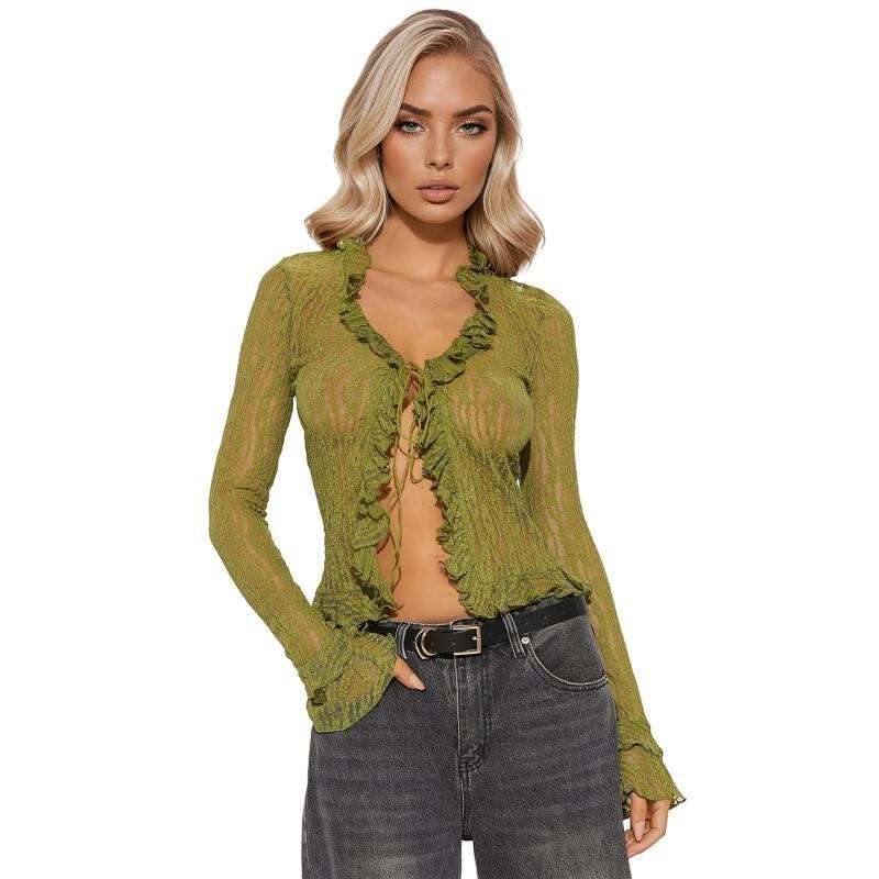 カーディガン レディース 透かし編み レース Vネック 長袖 ドローストリング タイト スリム ショート丈 羽織りトップス セクシー フェミニン カジュアル デート服