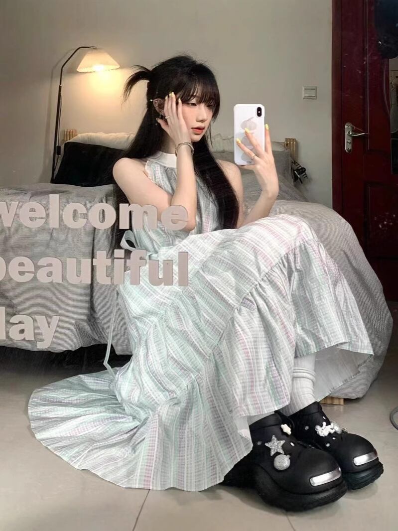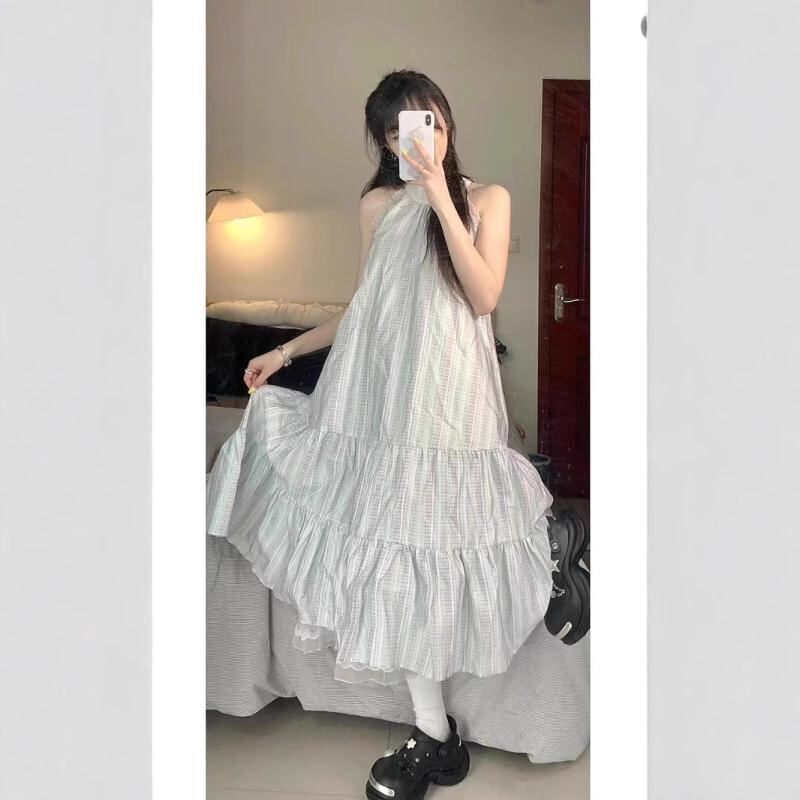 ワンピース レディース 韓国風 スクール風 ロング丈 ノースリーブ ホルターネック ハイウエスト Aライン ゆったり 上品 フェミニン 通勤 オフィス 普段使い 着回し プリーツ加工