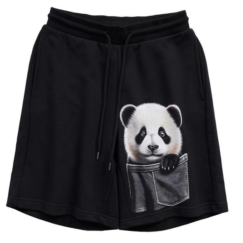 ショートパンツ メンズ 男性用 五分丈 ハーフパンツ パンダ柄 プリント ルーズフィット ゆったり コットン100% 綿素材 ブラック 黒 ポケット付き 伸縮性 夏物 ストリート系 カジュアル 普段使い リラックスウェア