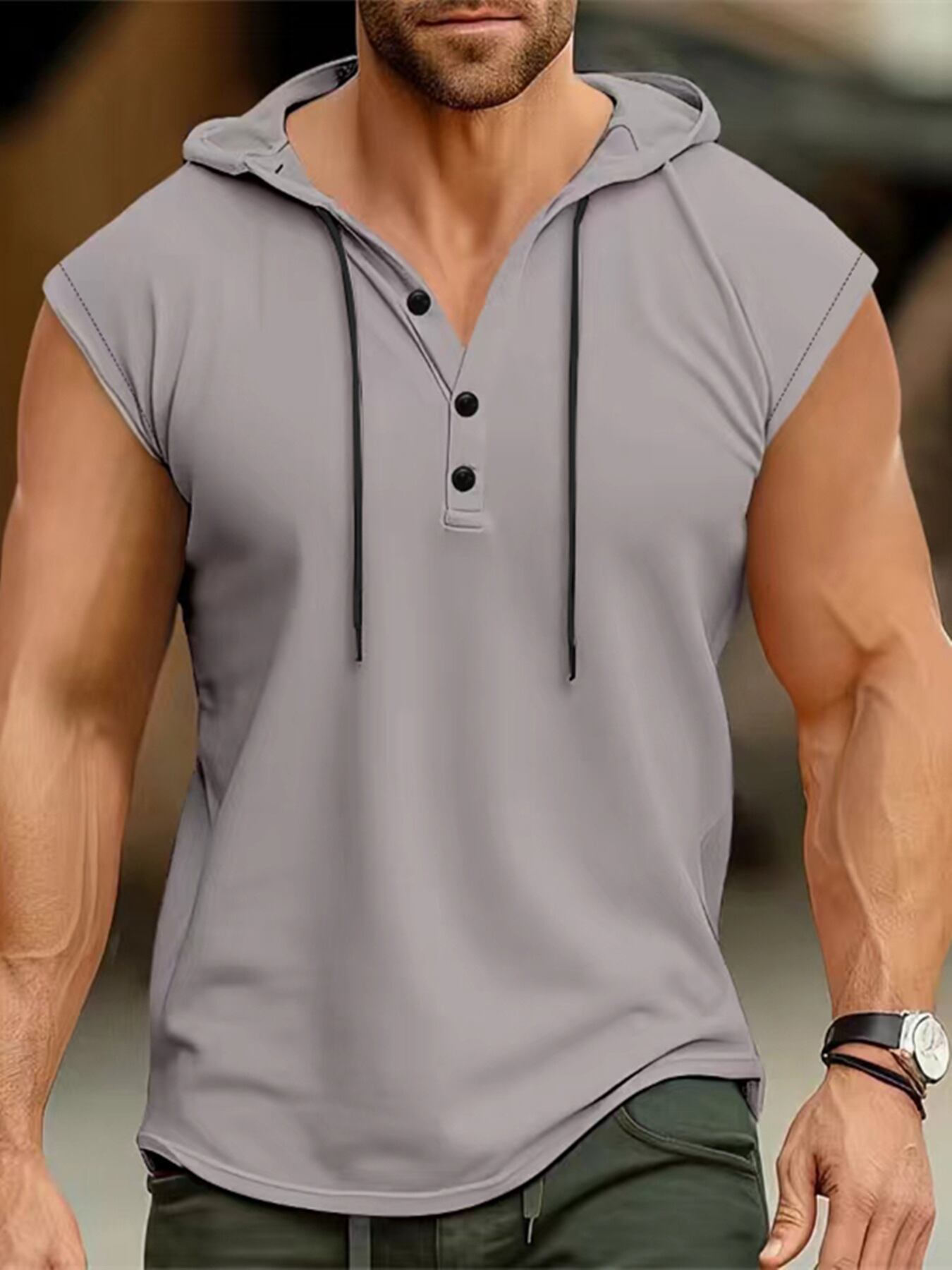タンクトップ メンズ ノースリーブ フード付き ドローストリング 無地 スポーツ トレーニング ジムウェア 薄手 夏用 ポリエステル 綿混紡 スリムフィット