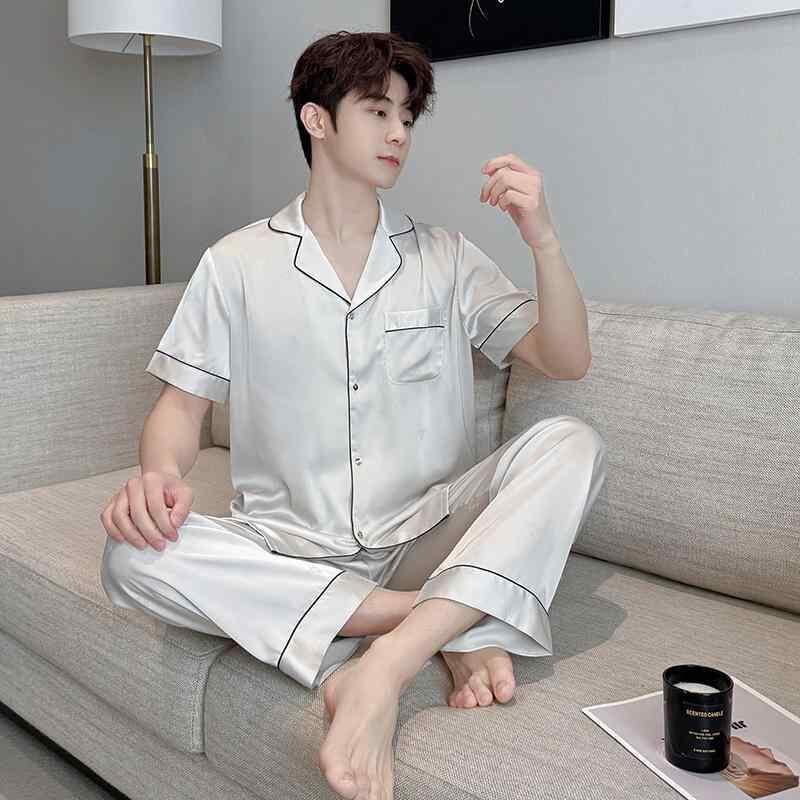 ルームウェア メンズ パジャマ セットアップ 開襟シャツ 七分袖 ロングパンツ ポリエステル サテン調 薄手 涼しい着心地 カジュアル 部屋着 ワンマイルウェア