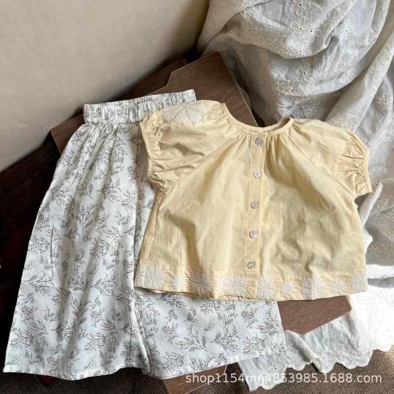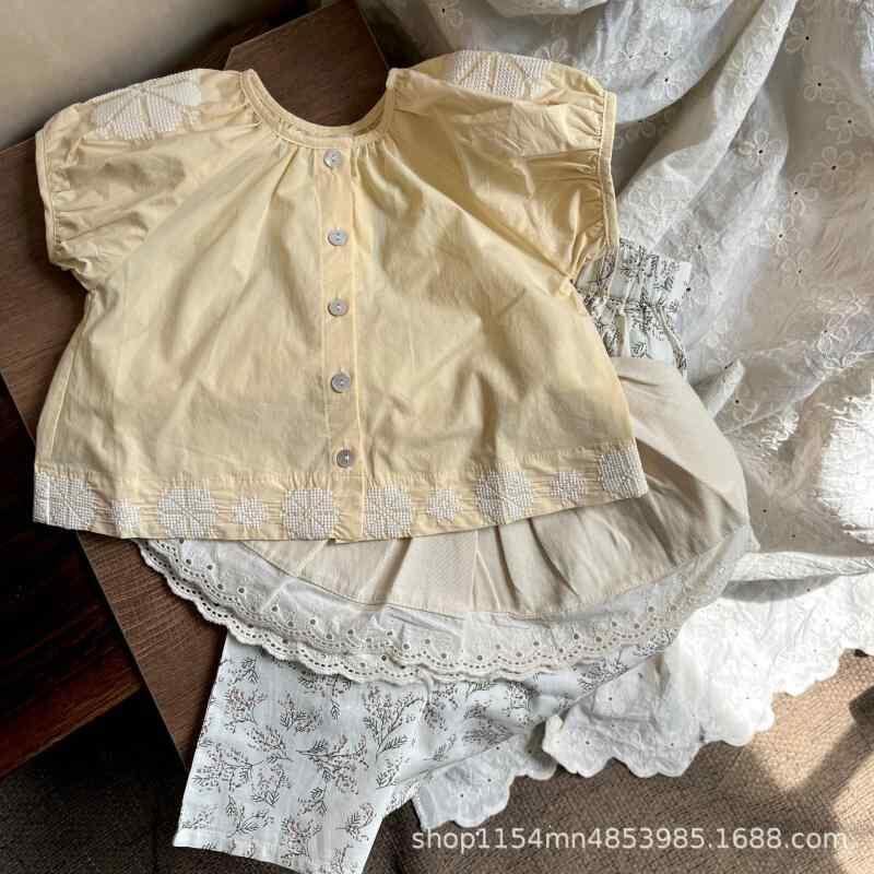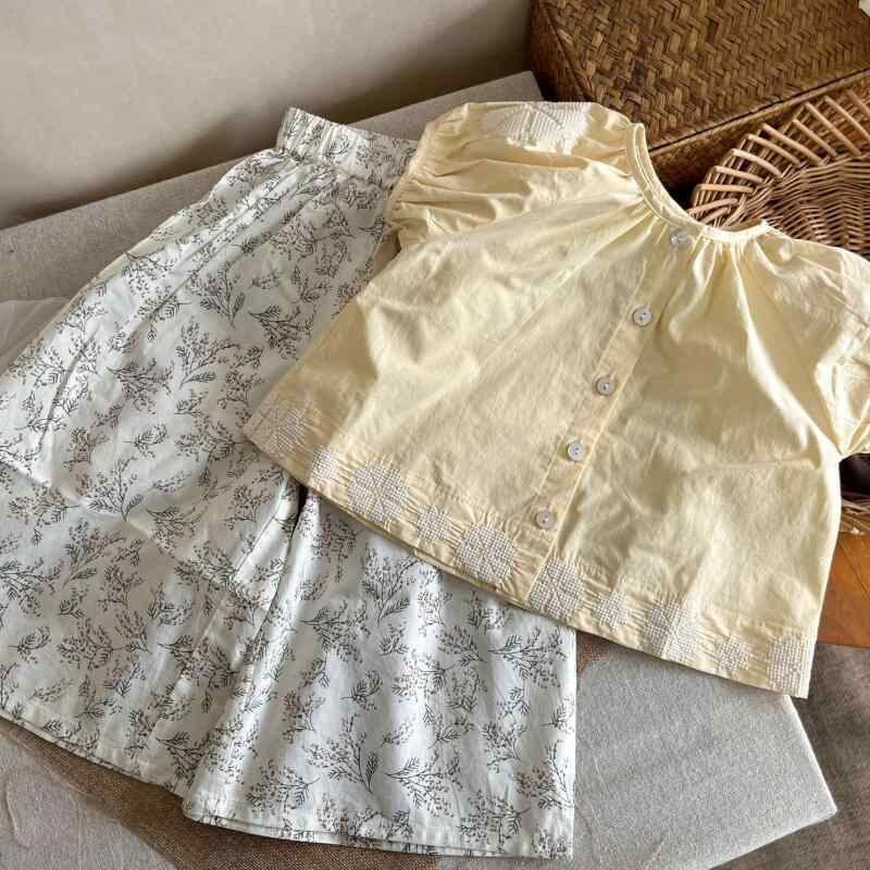 セットアップ キッズ 女の子 韓国風 おしゃれ 刺繍 パフスリーブ 半袖 ブラウス トップス 小花柄 虫よけ加工 ロングパンツ 長ズボン 綿 コットン 上下セット 夏物
