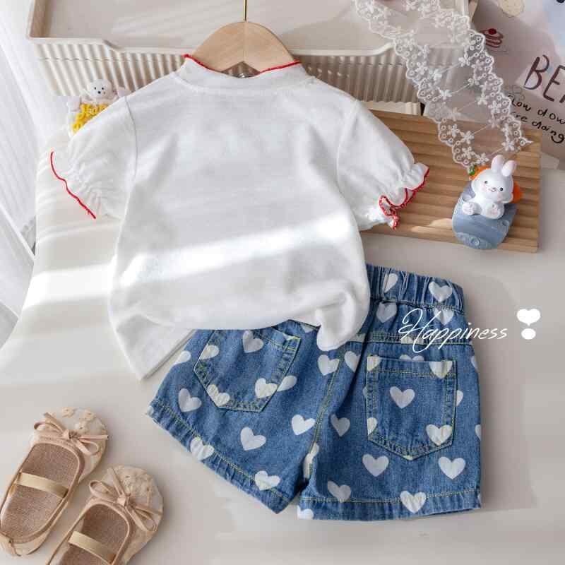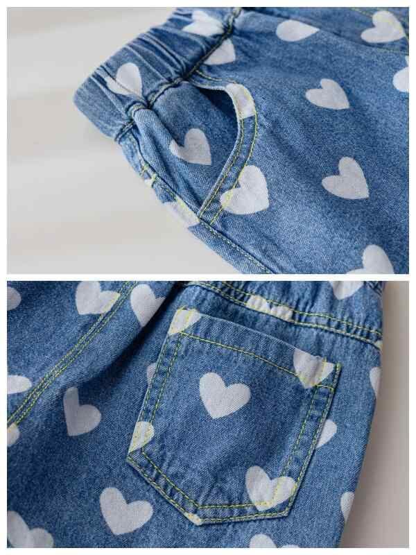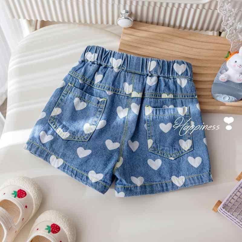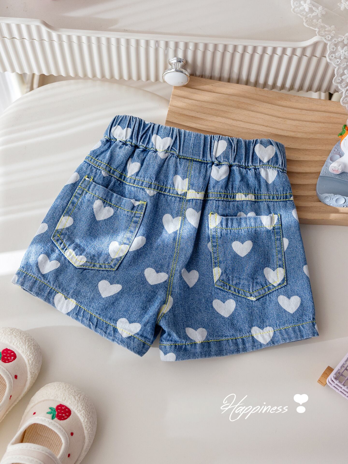 デニム ショートパンツ 女の子 ガールズ ハート柄 プリント カジュアル 韓国風 おしゃれ かわいい 夏服 綿 コットン 柔らかい ソフトな肌触り 子供服 普段使い 通園 通学 お出かけ着 ブルー 短パン