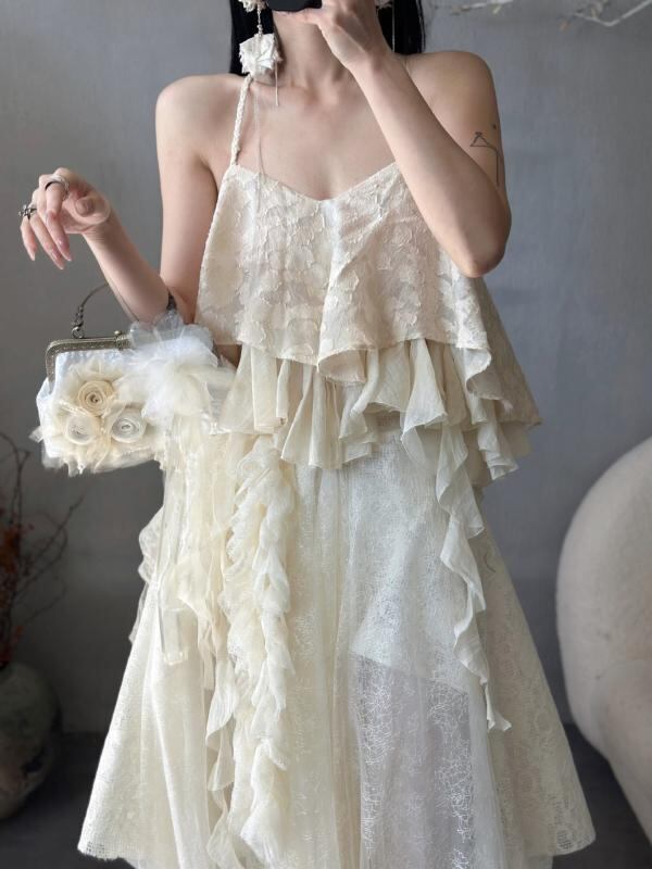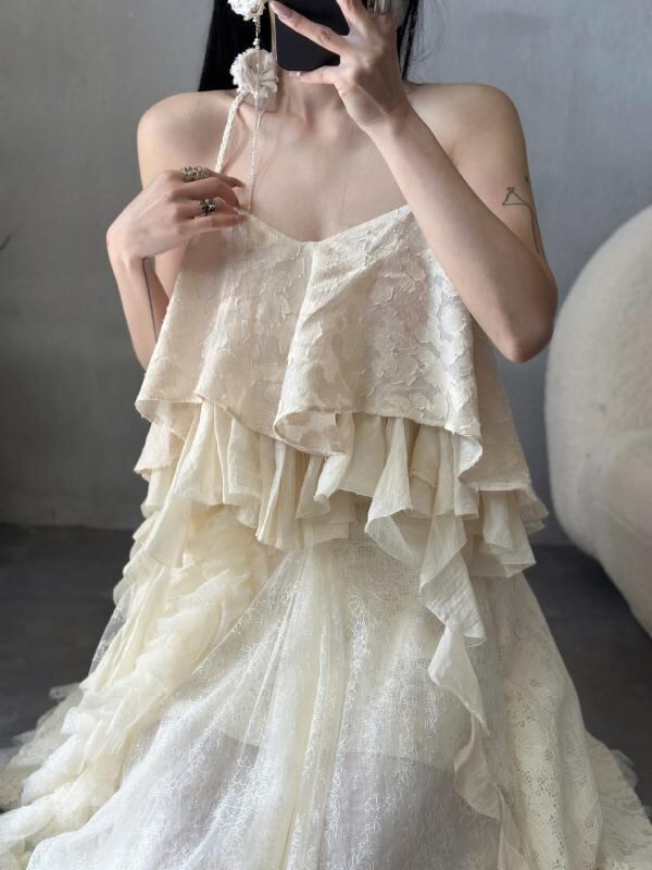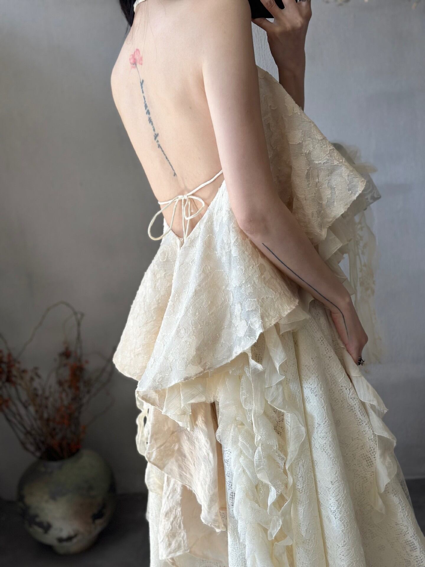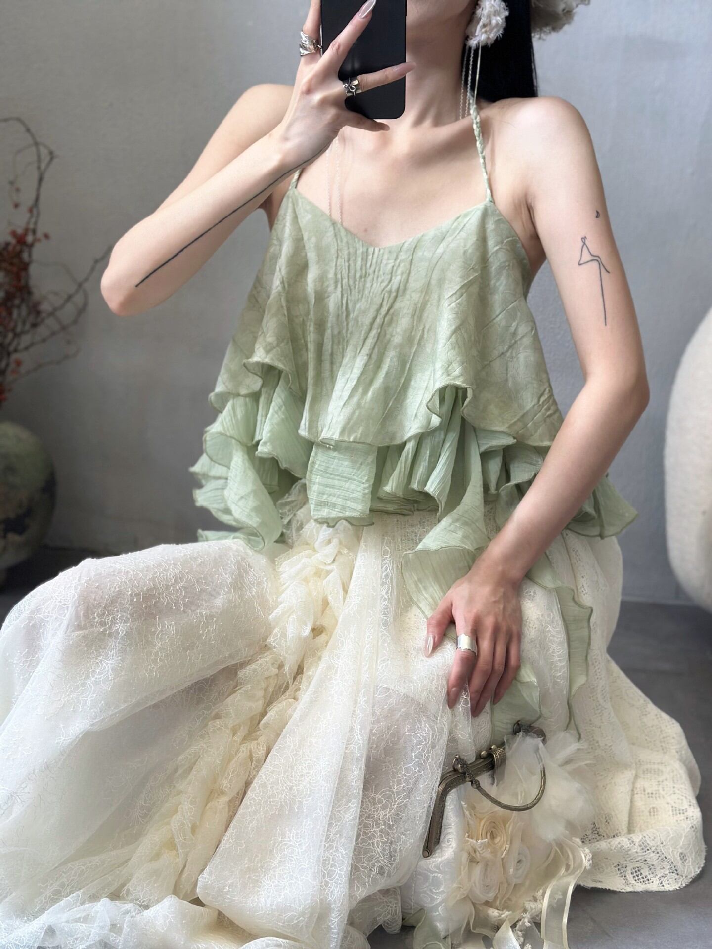 ブラウス レディース Aライン フリル ジャカード ホルターネック テンセル素材 レトロ カジュアル エレガント 上品 ライトグリーン オフホワイト
