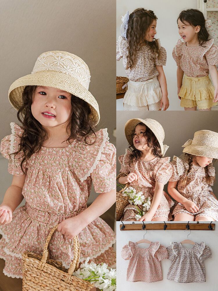 ブラウス 女の子 子供服 かわいい フェミニン スクエアネック 小花柄 レース フリル パフスリーブ 半袖 コットン やわらか 夏物 お出かけ 普段使い