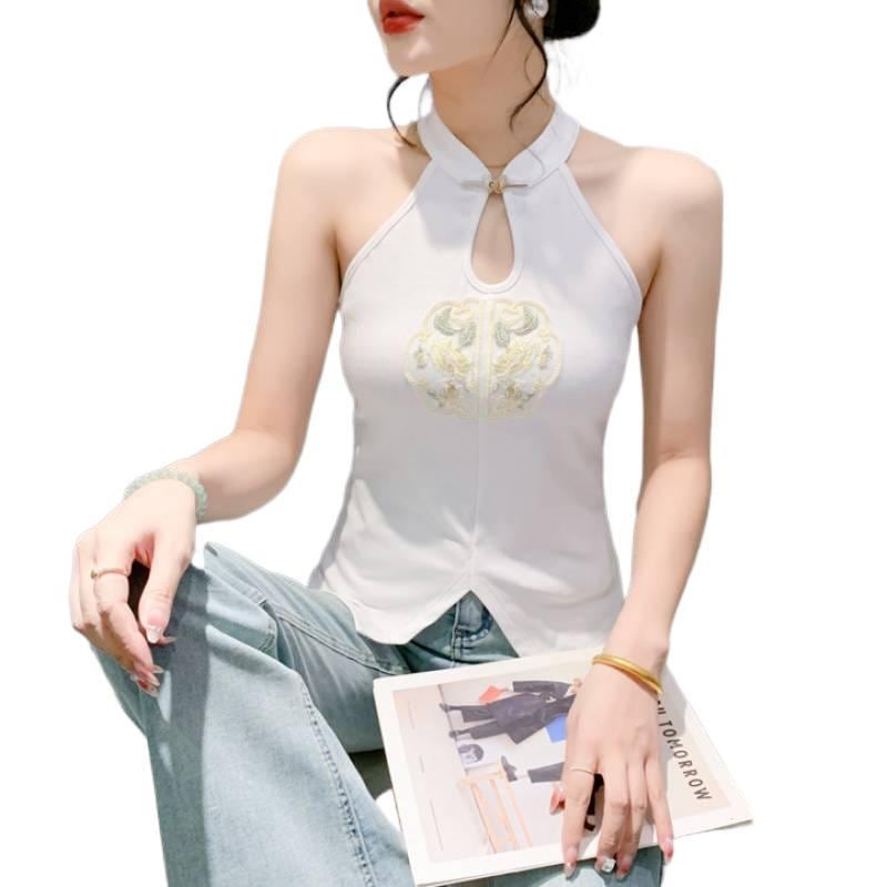 トップス レディース 中華風 刺繡 ホルターネック キャミソール ノースリーブ 夏物 オフショルダー スリム見え 体型カバー 大きいサイズ ゆったり ポリエステル 都会的 エレガント