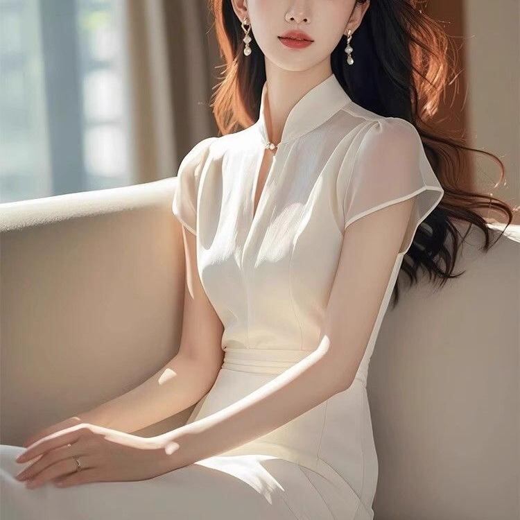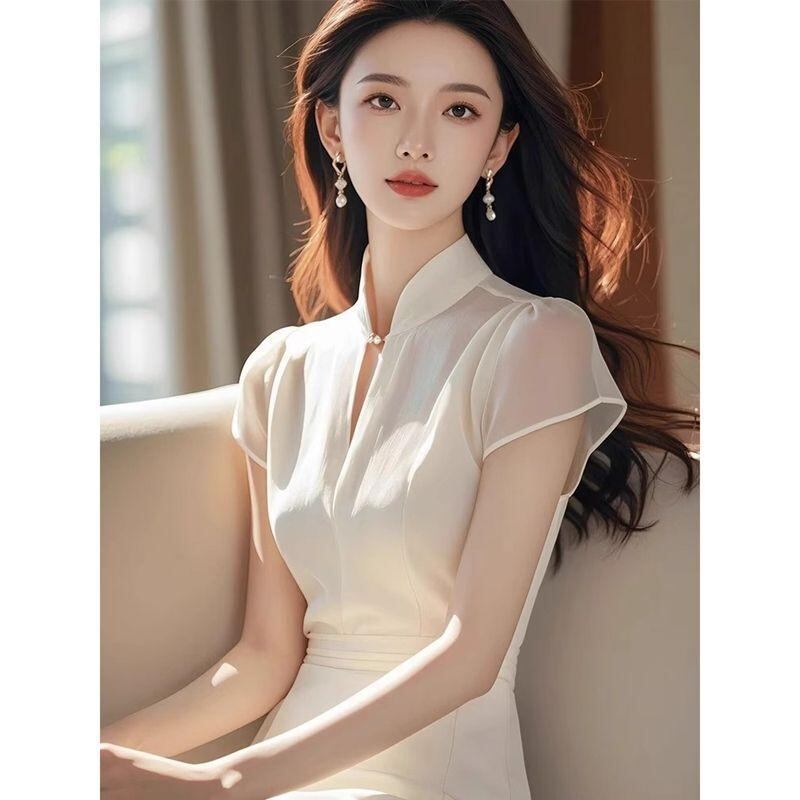 ワンピース レディース 新中華風 モダンチャイナ エレガント 上品 高級感 綿 ポリエステル 混紡 Aライン ミモレ丈 長袖 ウエストゆったり シワになりにくい イージーケア オフホワイト アイボリー