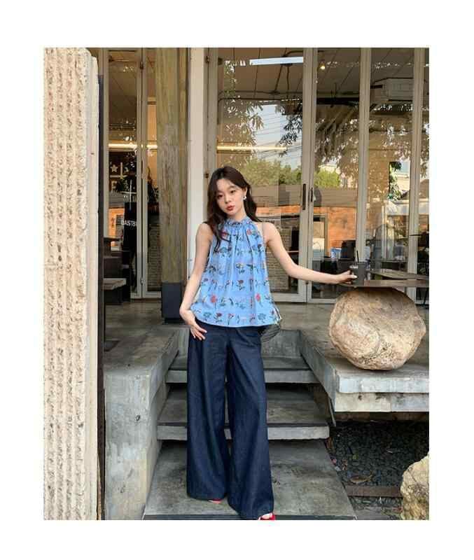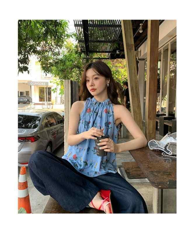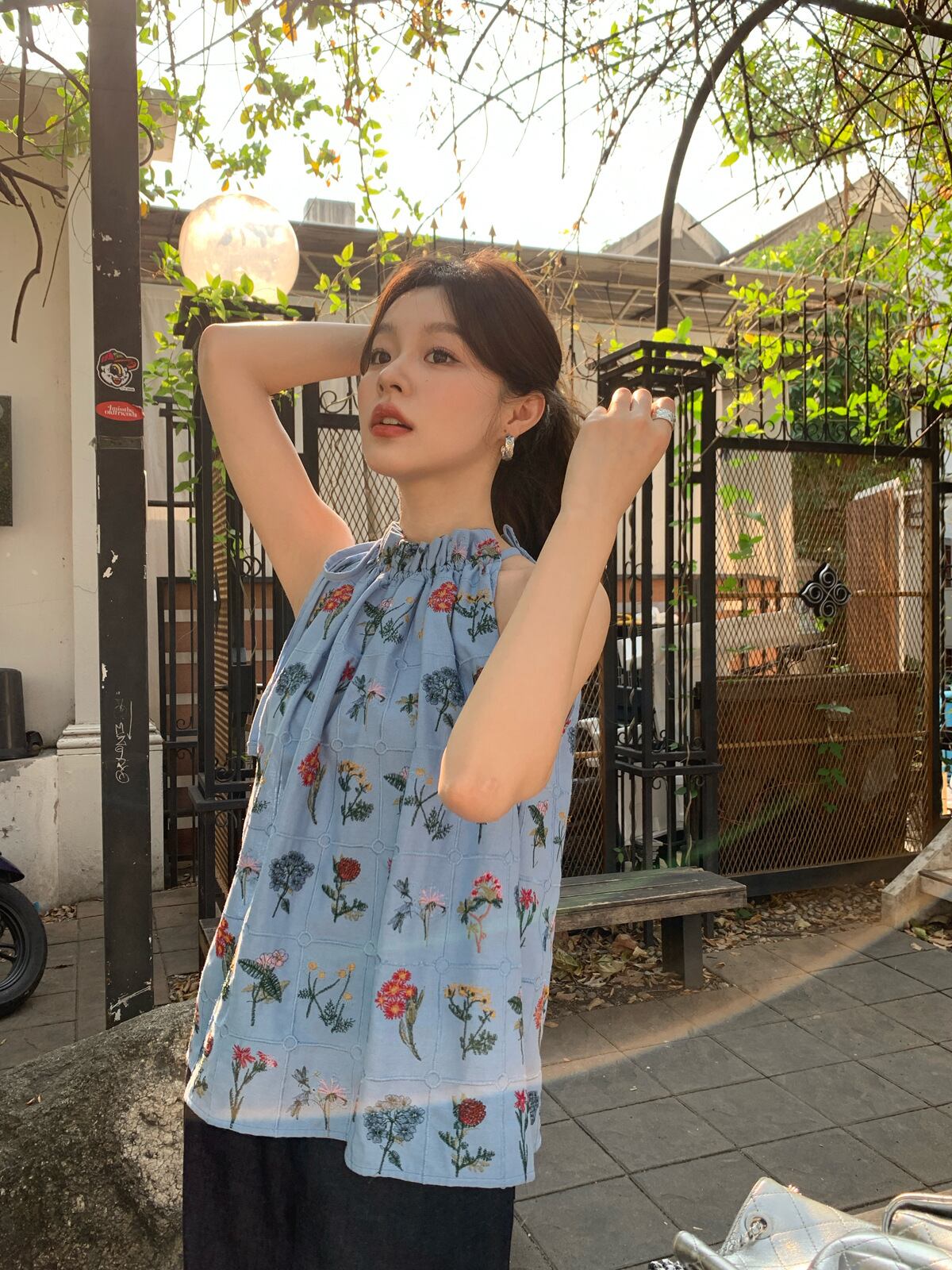 キャミソール レディース ホルターネック ノースリーブ スリムフィット ミドル丈 花柄 刺繍 リボン レーヨン リゾート カジュアル かわいい スウィート カヌレ風 ブルー ノンストレッチ