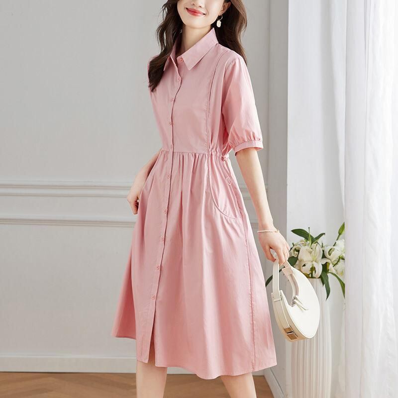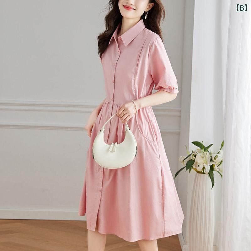 シャツワンピース レディース 半袖 綿 ポロ襟 ミモレ丈 ゆったり Aライン フレア フレンチ エレガント 上品 通勤 オフィス デイリー お出かけ