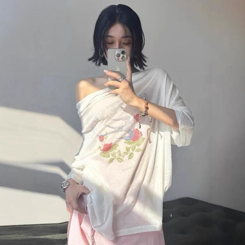 Tシャツ レディース 韓国風 ワンショルダー 半袖 Vネック バックオープン ローズツバメ ボタニカル柄 ミドル丈 UVカット コットン 薄手 日韓カジュアル リラックススタイル チュニック丈