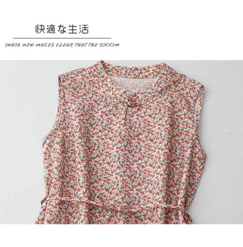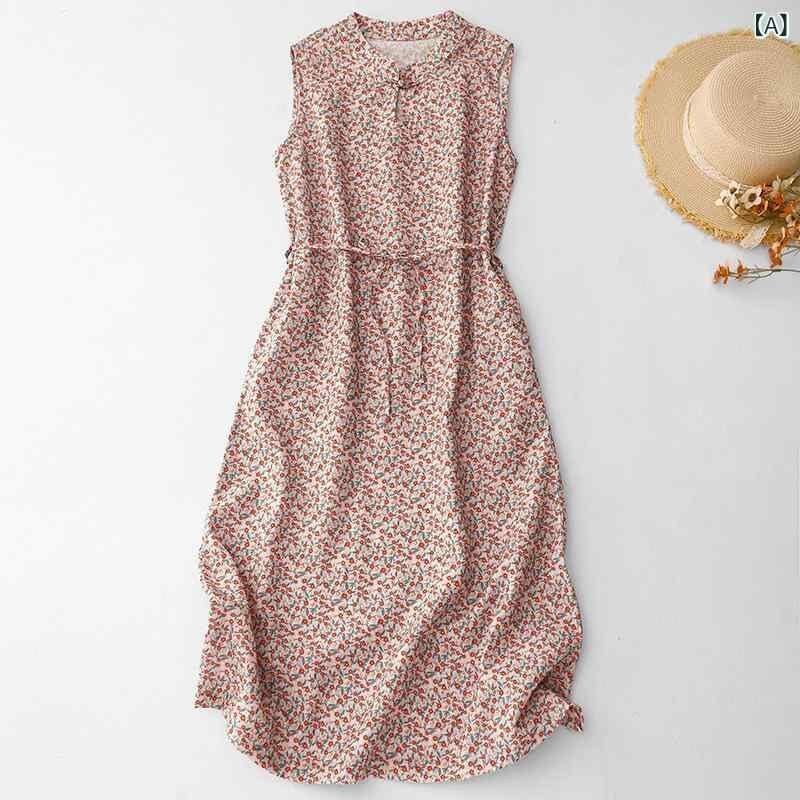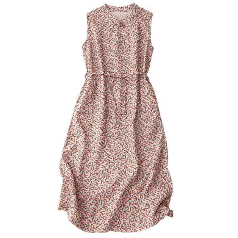 ワンピース レディース ゆったり レトロ 小花柄 プリント ノースリーブ タンクトップ ハイネック Aライン ミディ丈 綿混 ポリエステル ダークピンク系 ボヘミアン風 カジュアル リラックス 普段使い お出かけ