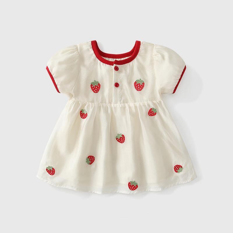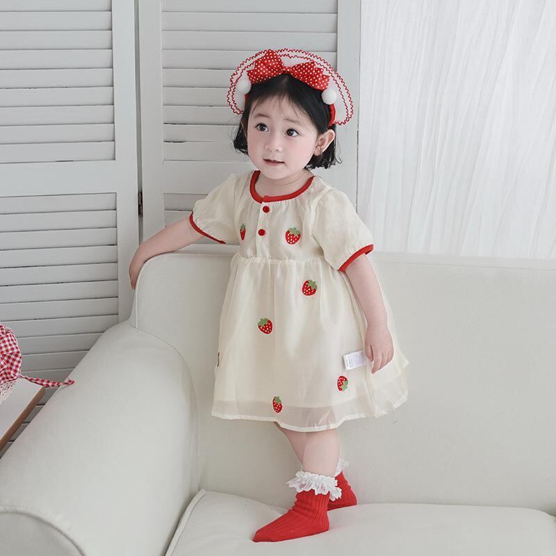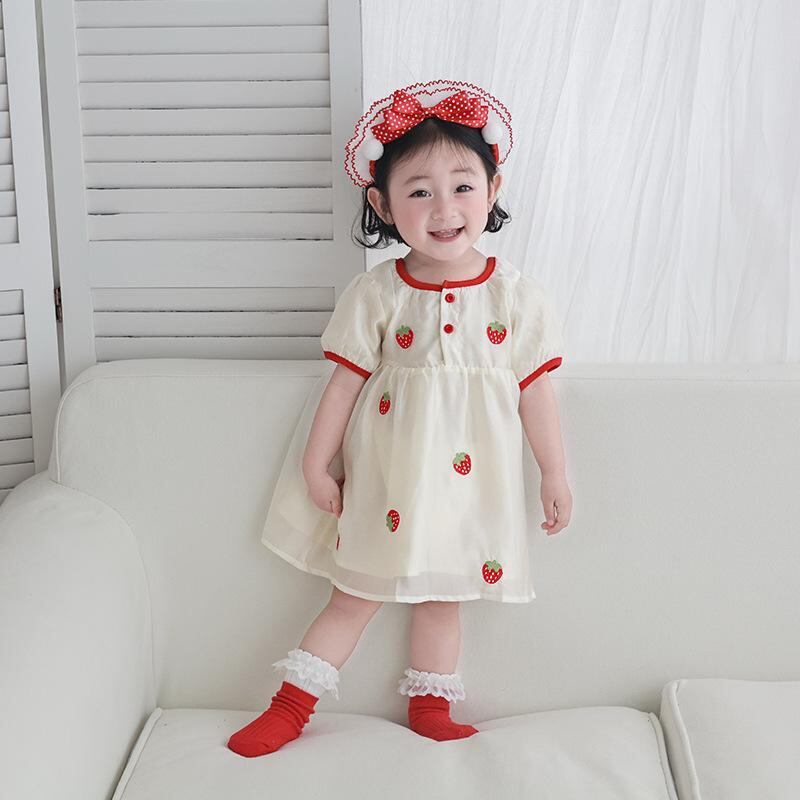 ワンピース キッズ 女の子 ベビー 半袖 いちご柄 プリンセスドレス 夏服 かわいい ガーリー スイート おしゃれ ダブルチュールスカート Aライン フレア 綿混 コットン ポリエステル レッド