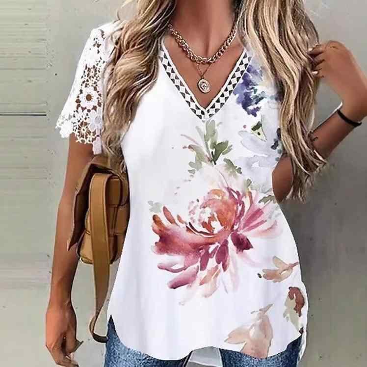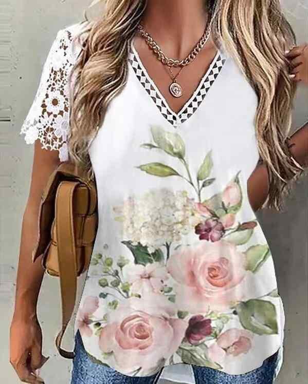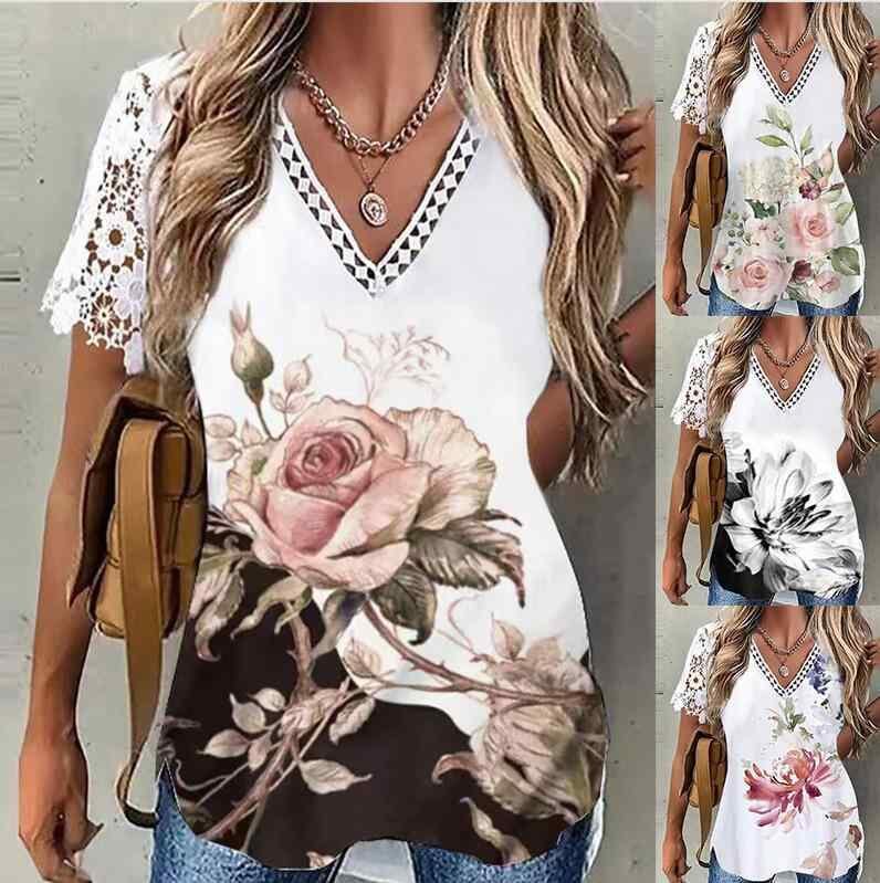 Tシャツ レディース レース袖 フリル切り替え 花柄 植物柄 Vネック 半袖 ポリエステル素材 プルオーバー 日韓風 カジュアル リラックス 普段使い 赤 黒 ローズゴールド ピンク 白 多色展開