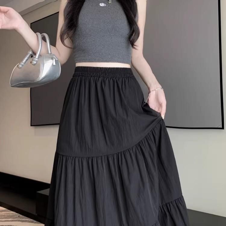 スカート レディース ハイウエスト ティアードスカート 薄手 夏 体型カバー Aライン ミモレ丈 大きいサイズ ゆったり フリル 無地 ポリエステル 普段使い エレガント ガーリー 白 黒
